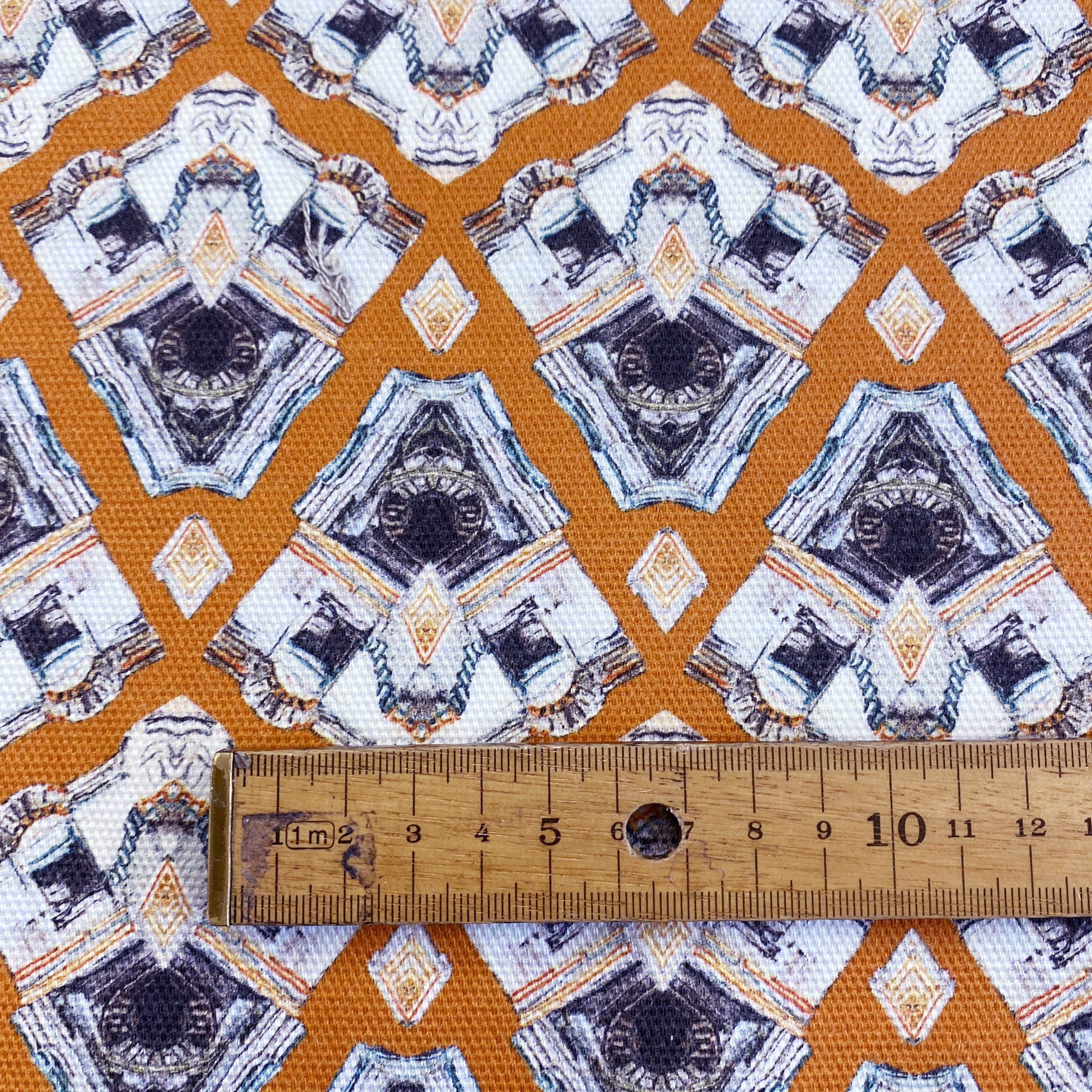 A medium weight, geometric design, in tones of teal and orange.  This fabric has an elegant feel, perfect for creating a stylish environment. Suitable for soft furnishing and crafts.