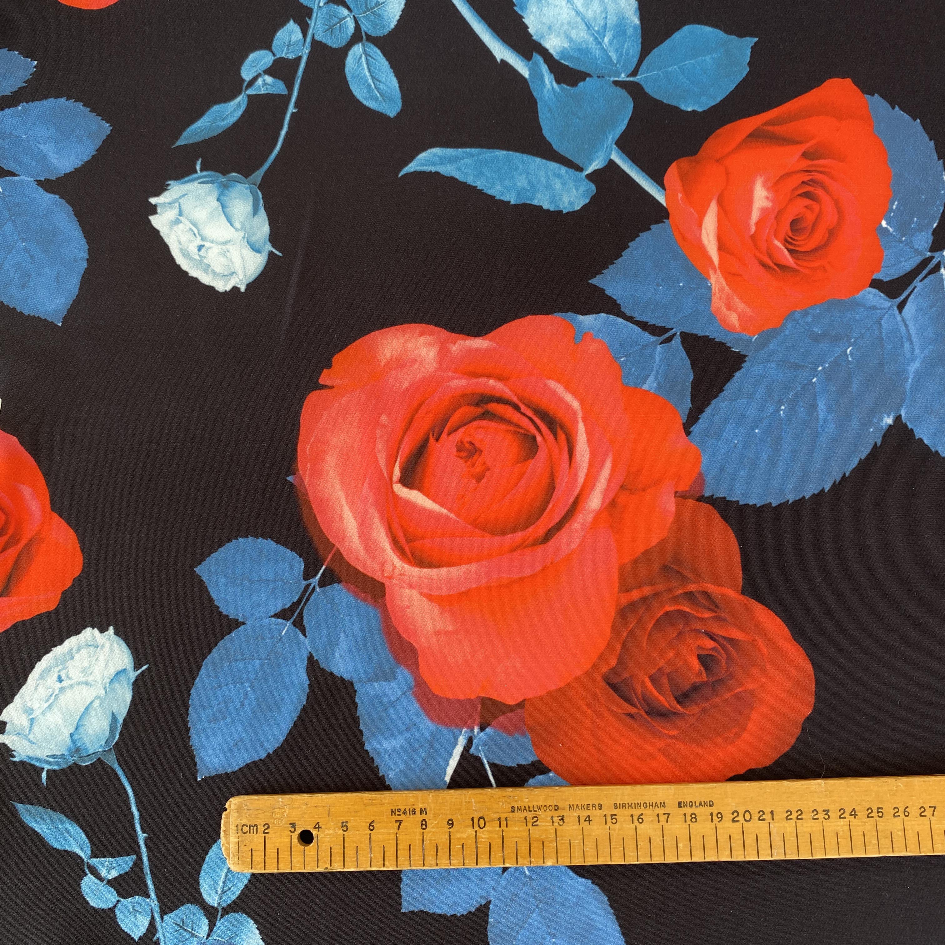This beautiful large print floral design is lightweight with an elegant drape, with stylish red roses, set on a black background, this would be ideal for a wrap dress.