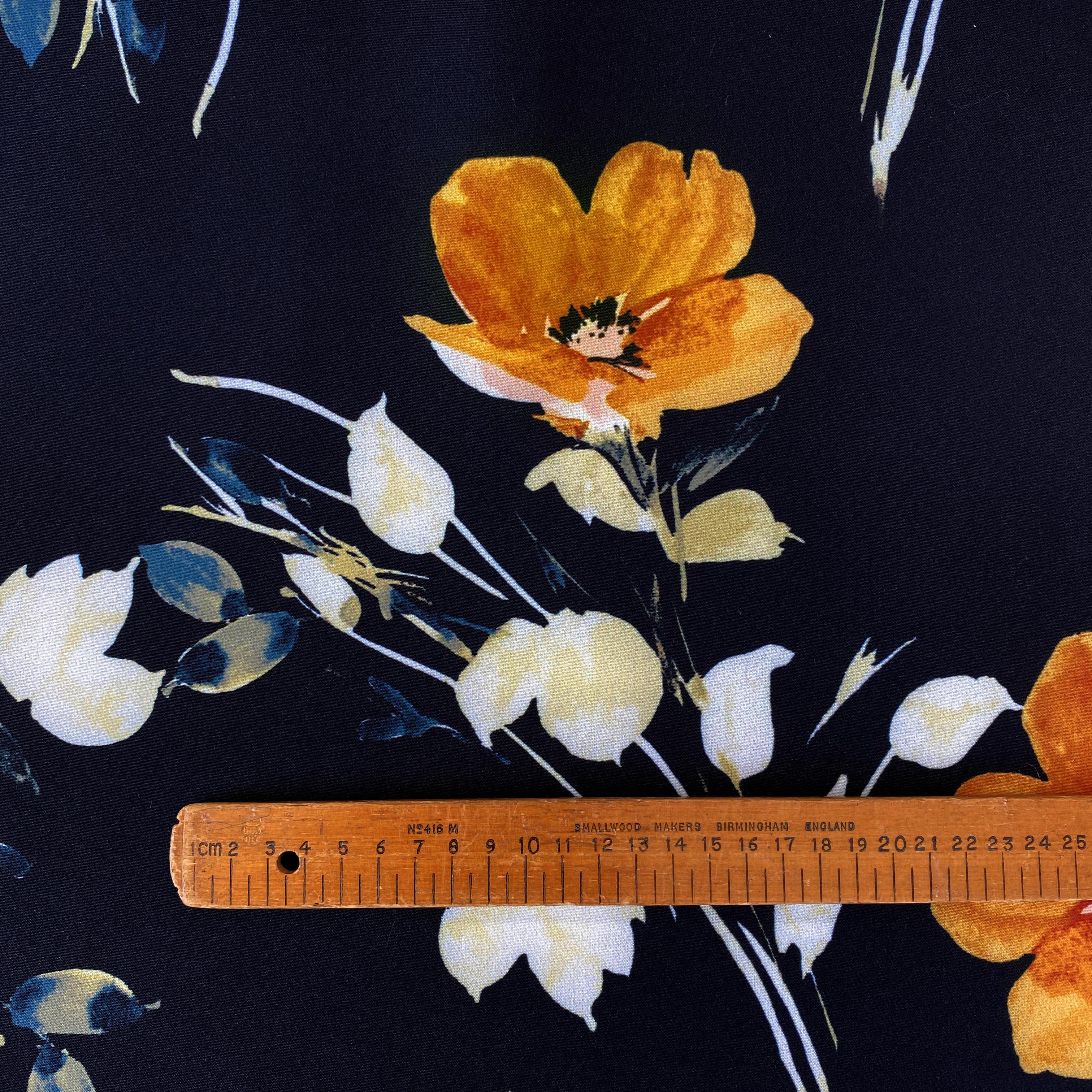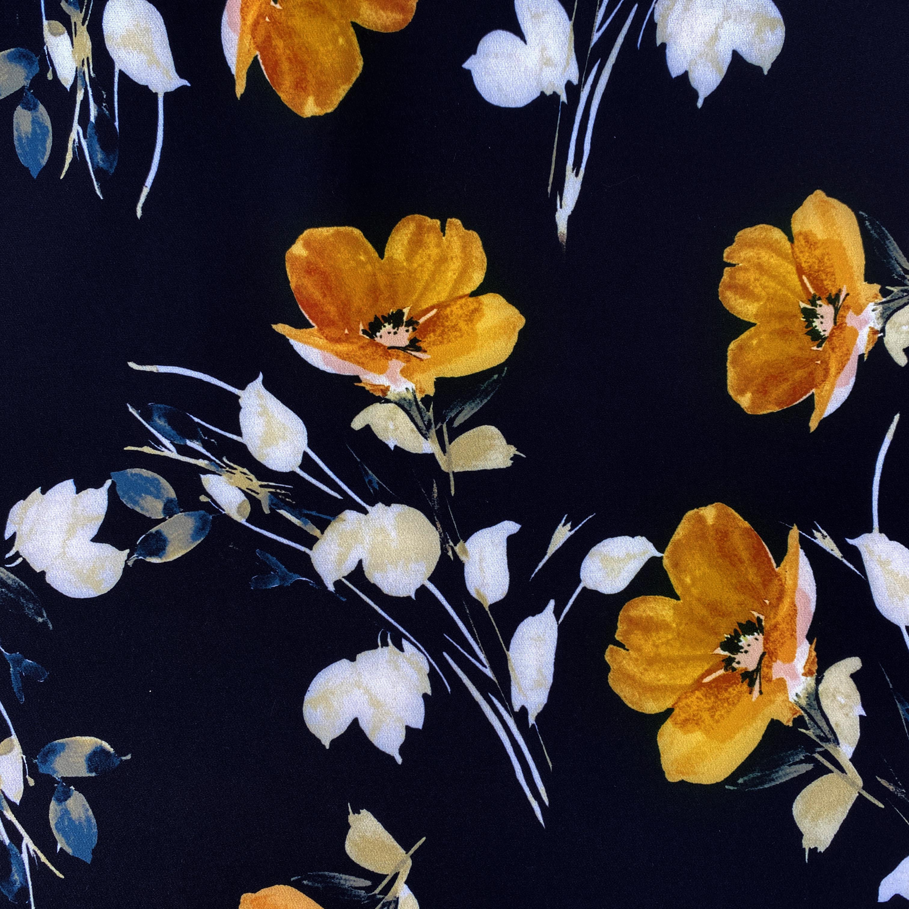 This beautiful large print floral design is lightweight with an elegant drape, with stylish yellow/orange flowers, set on a black background, this would be ideal for a wrap dress.