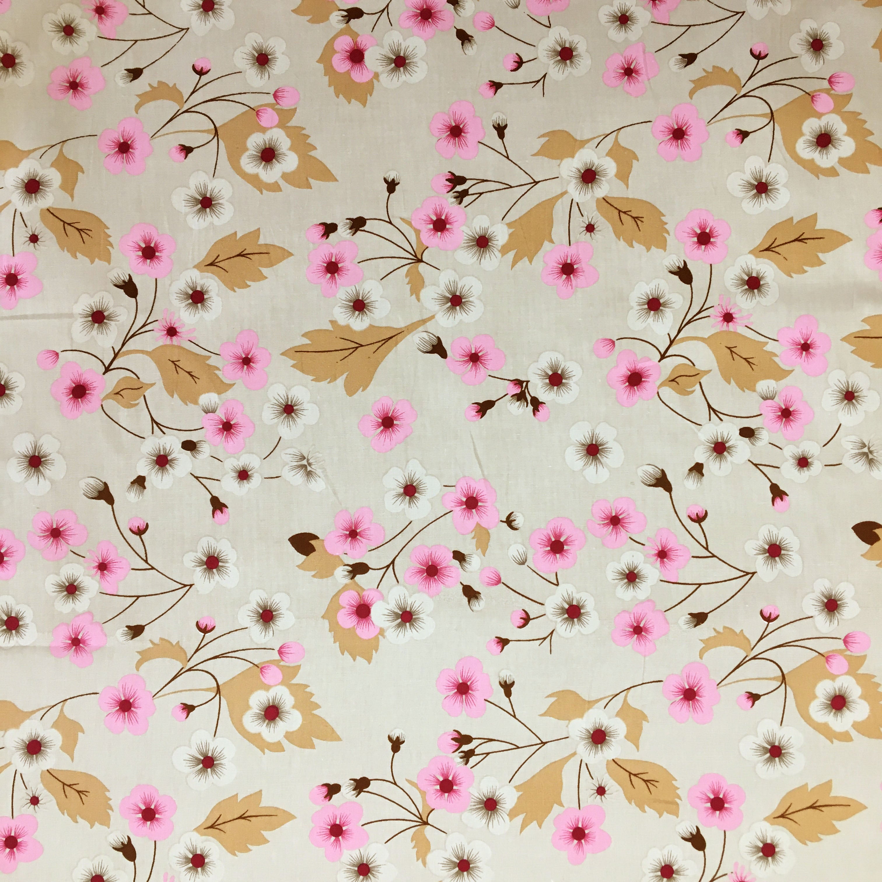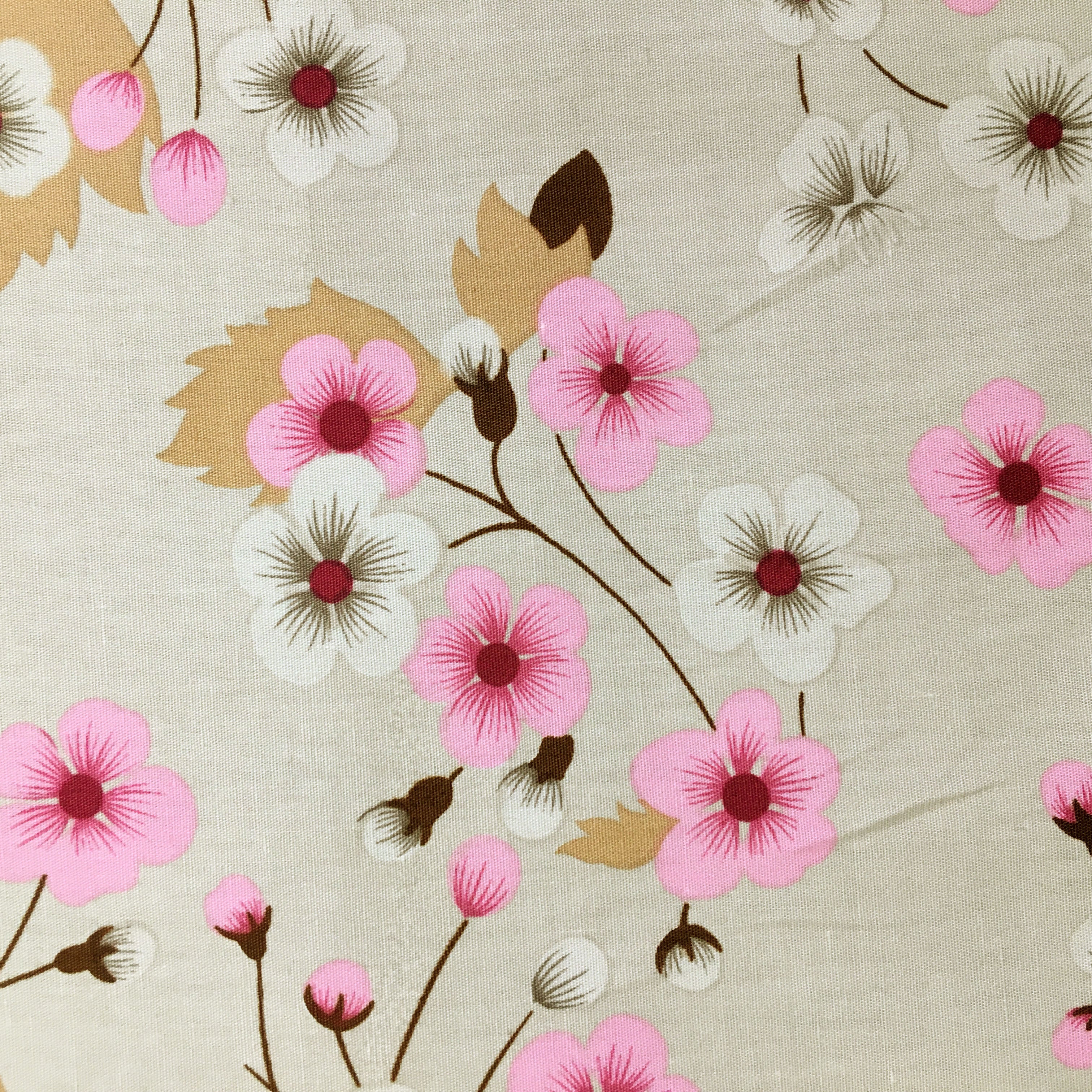 A beautiful large flower print with pink and beige flowers on a soft brown fawn background.