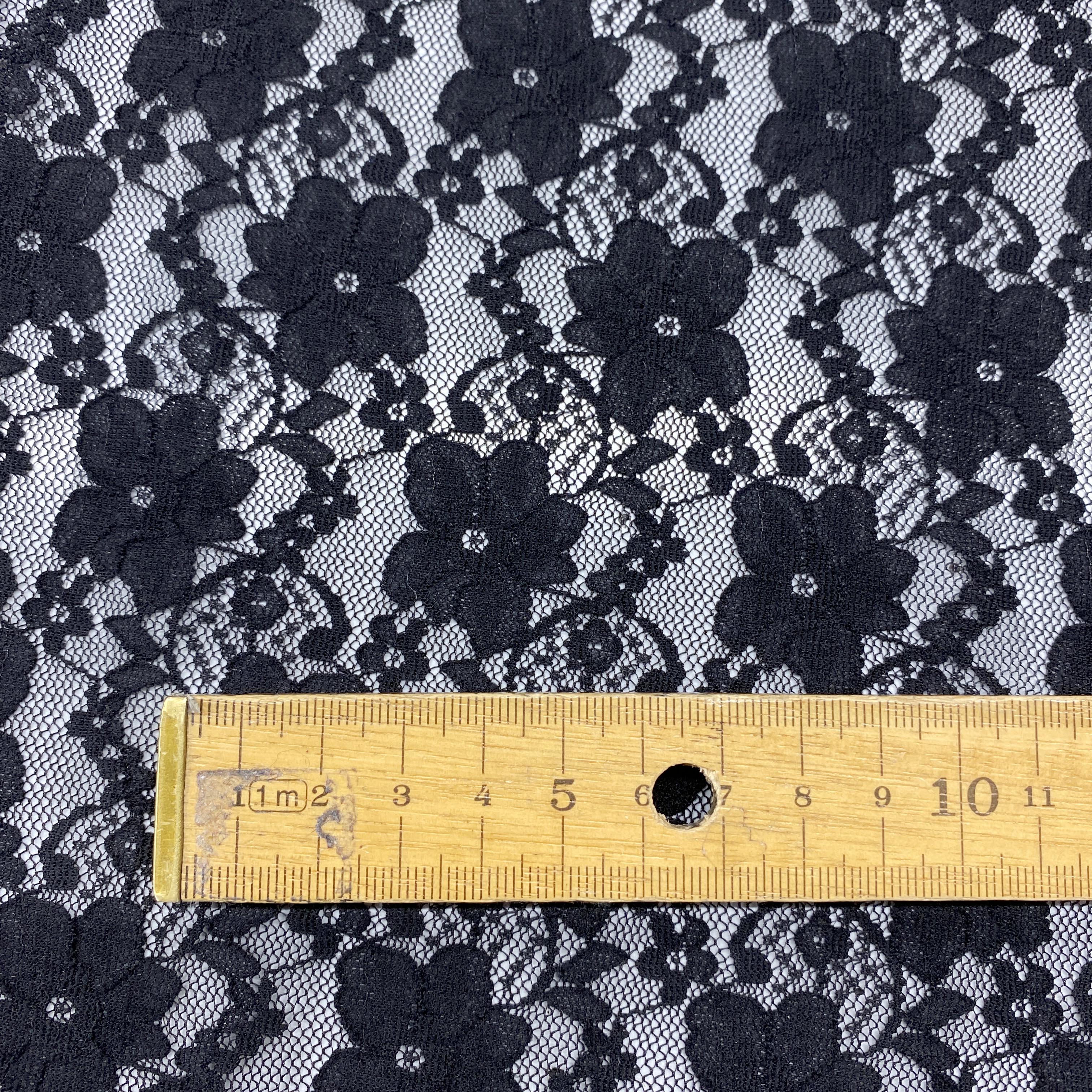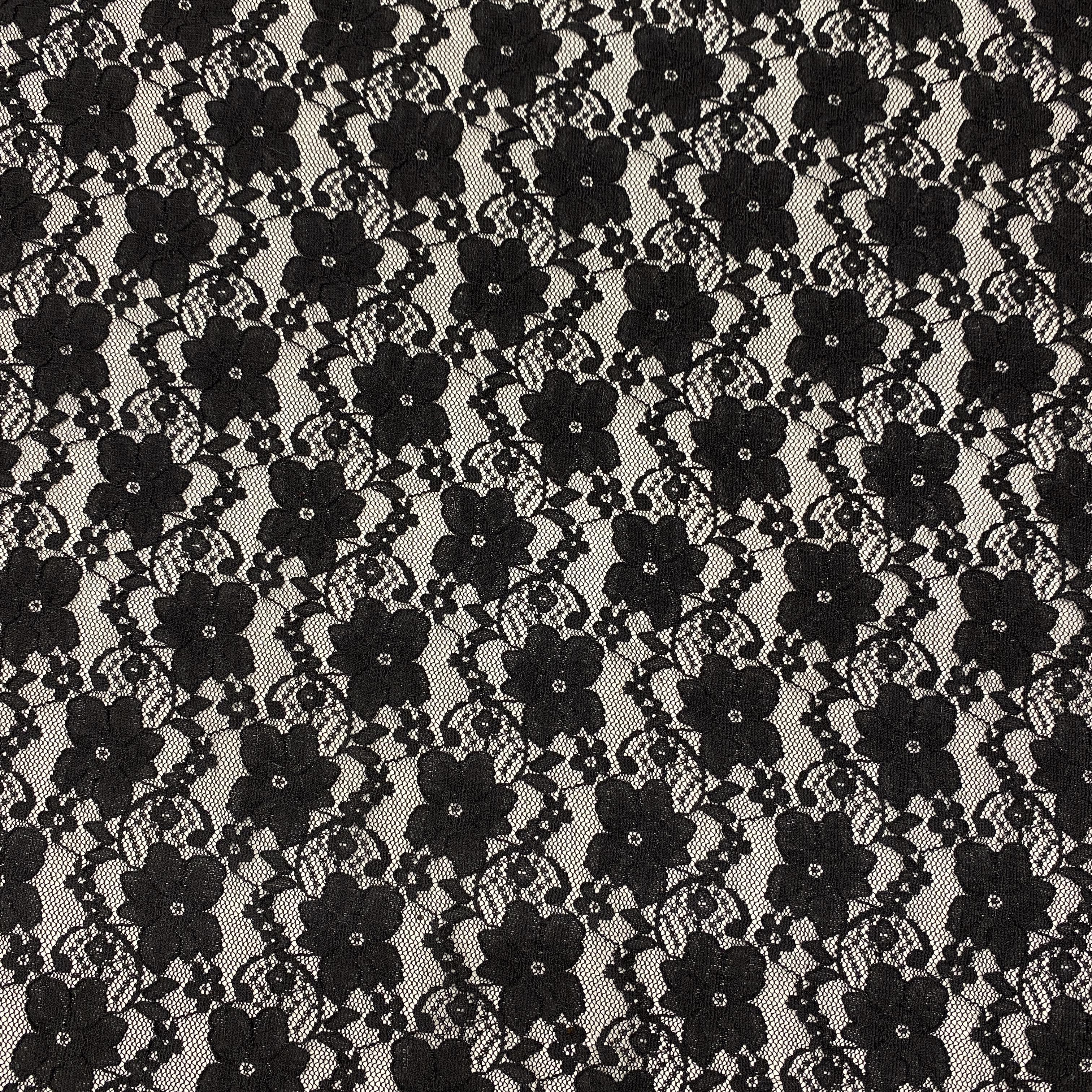 A lightweight slight stretch lace in a deep tone of gothic black with a floral design.