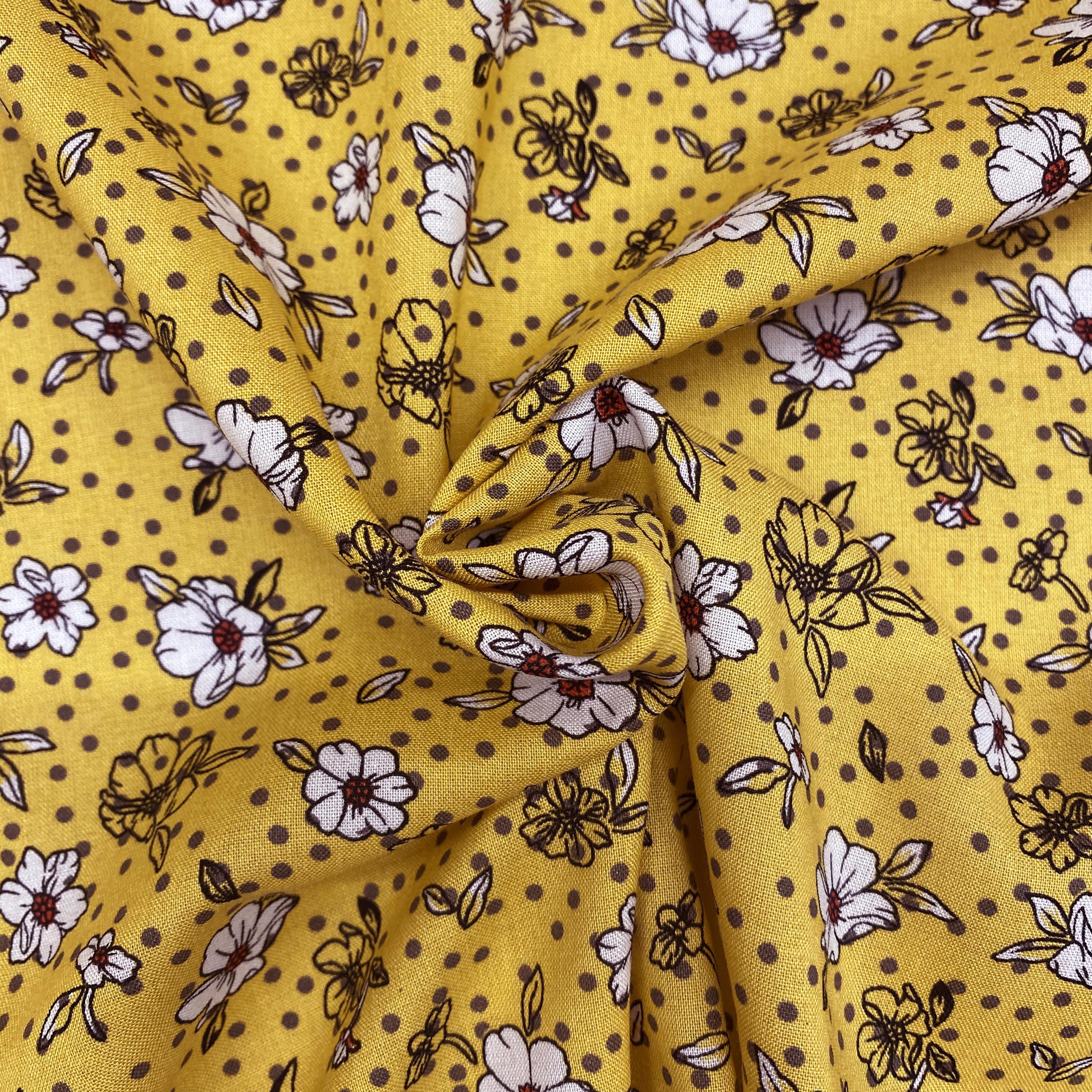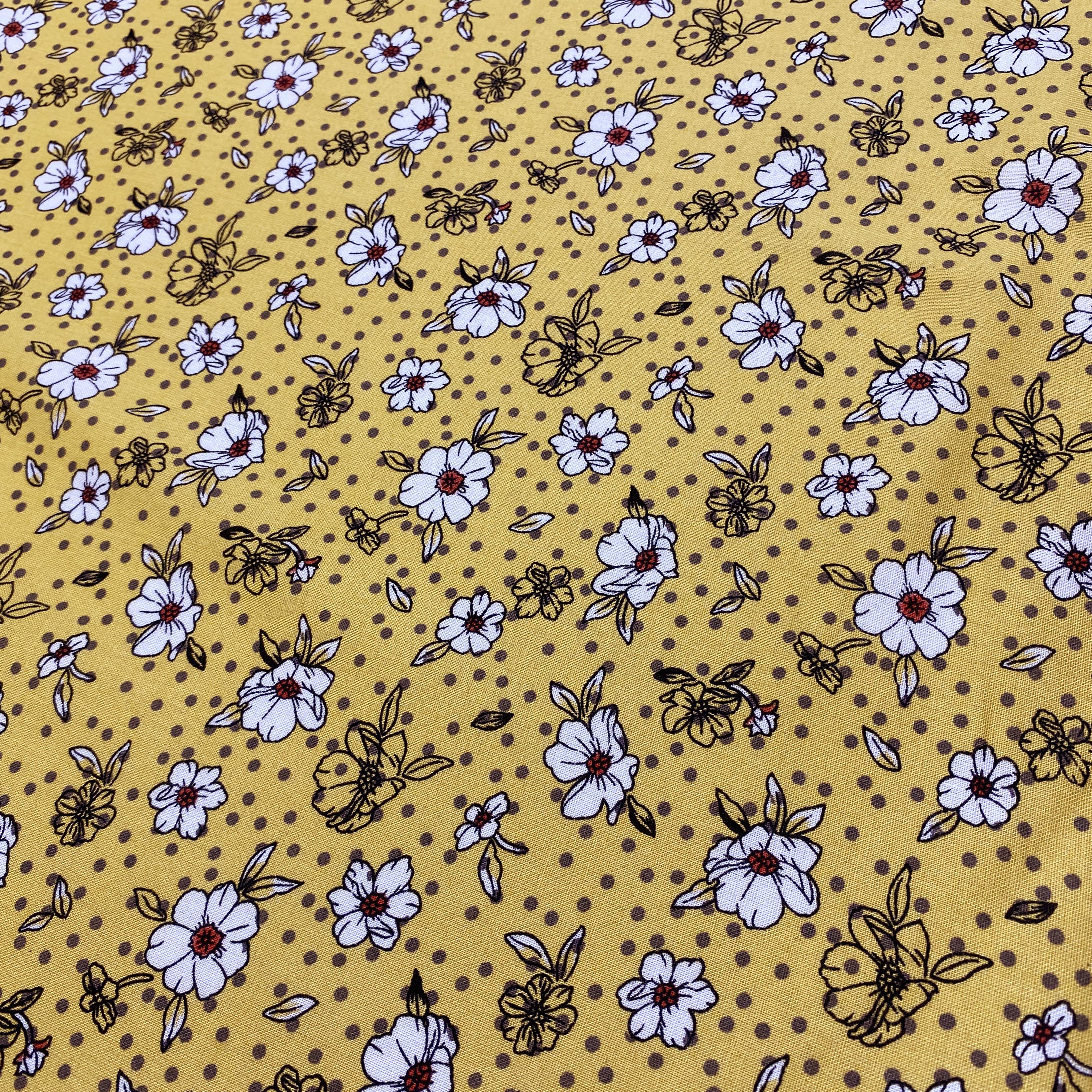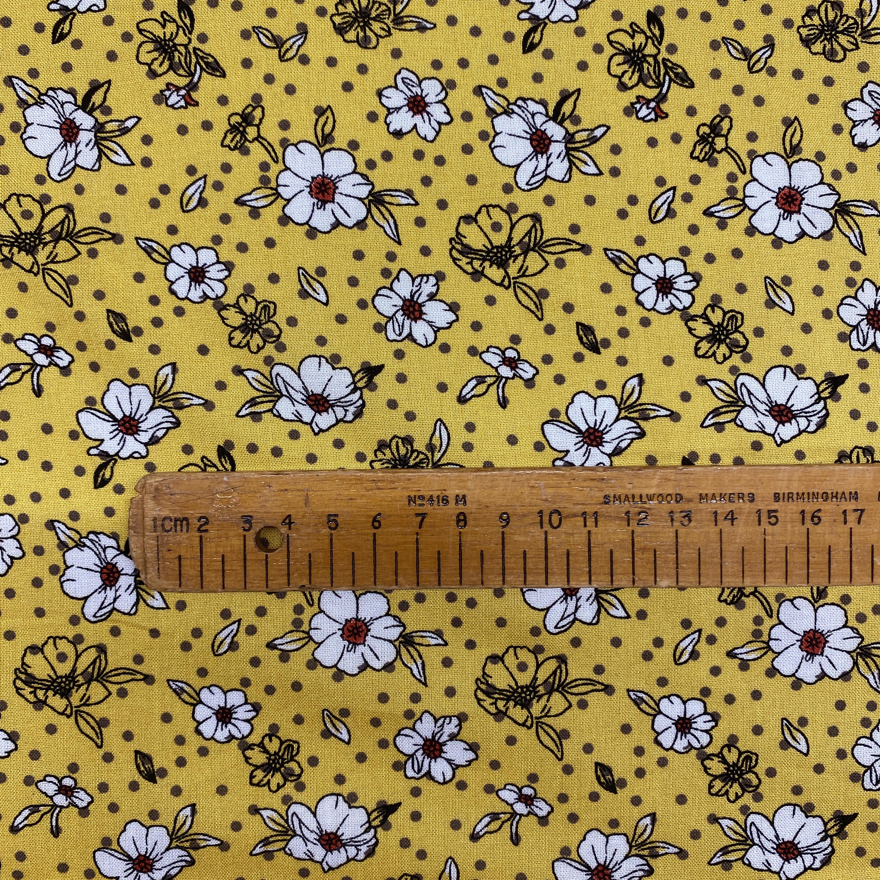Fantastic value lightweight cotton print fabric. with a pretty white floral design on a honey yellow background. Would be ideal for dress making, crafts and accessories.
