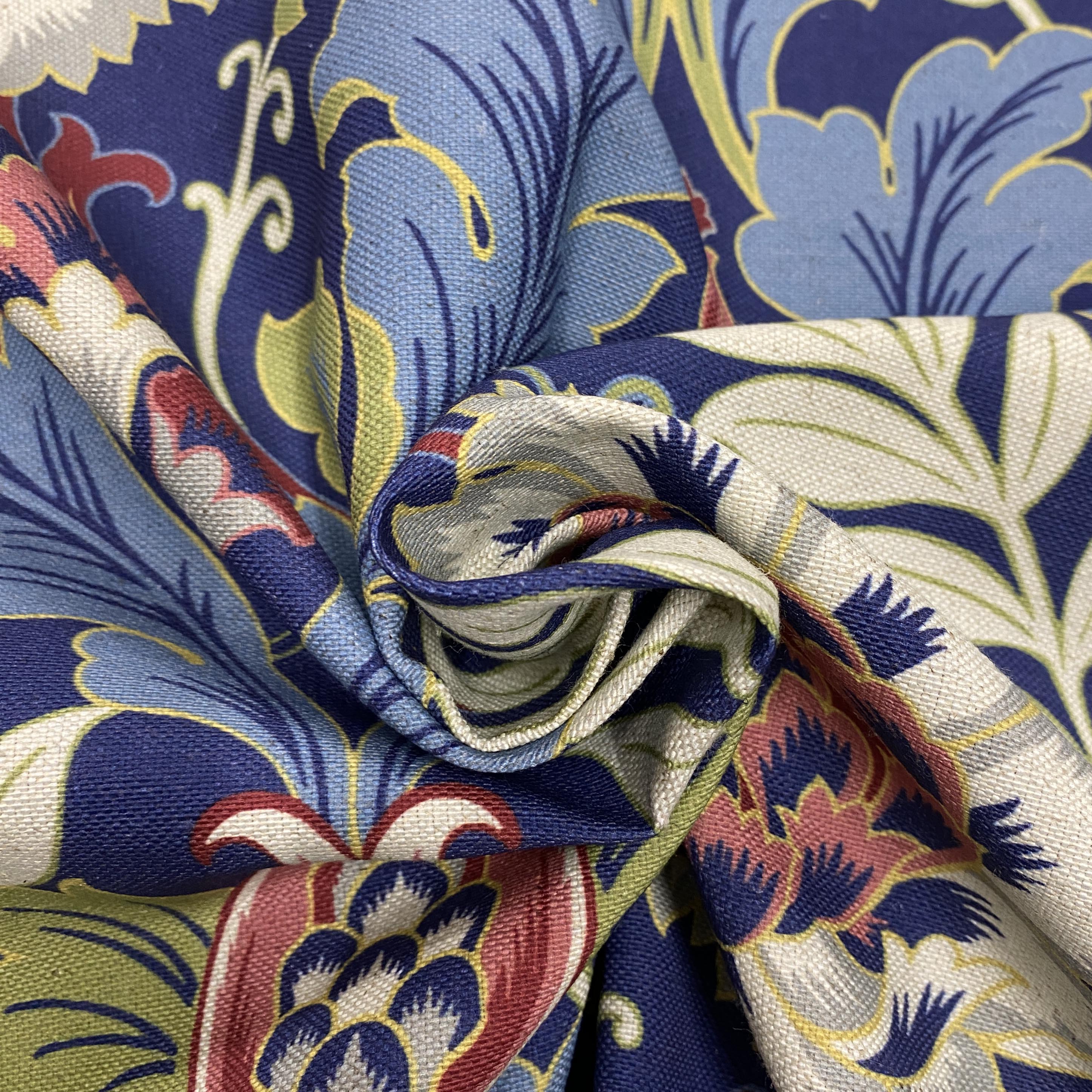 A striking floral design, in a range of vivid colours, set on a blue background with a vintage style. This fabric is perfect for making a statement and adding a colour splash in any home. Ideal for soft furnishing, curtains, blinds and light upholstery.