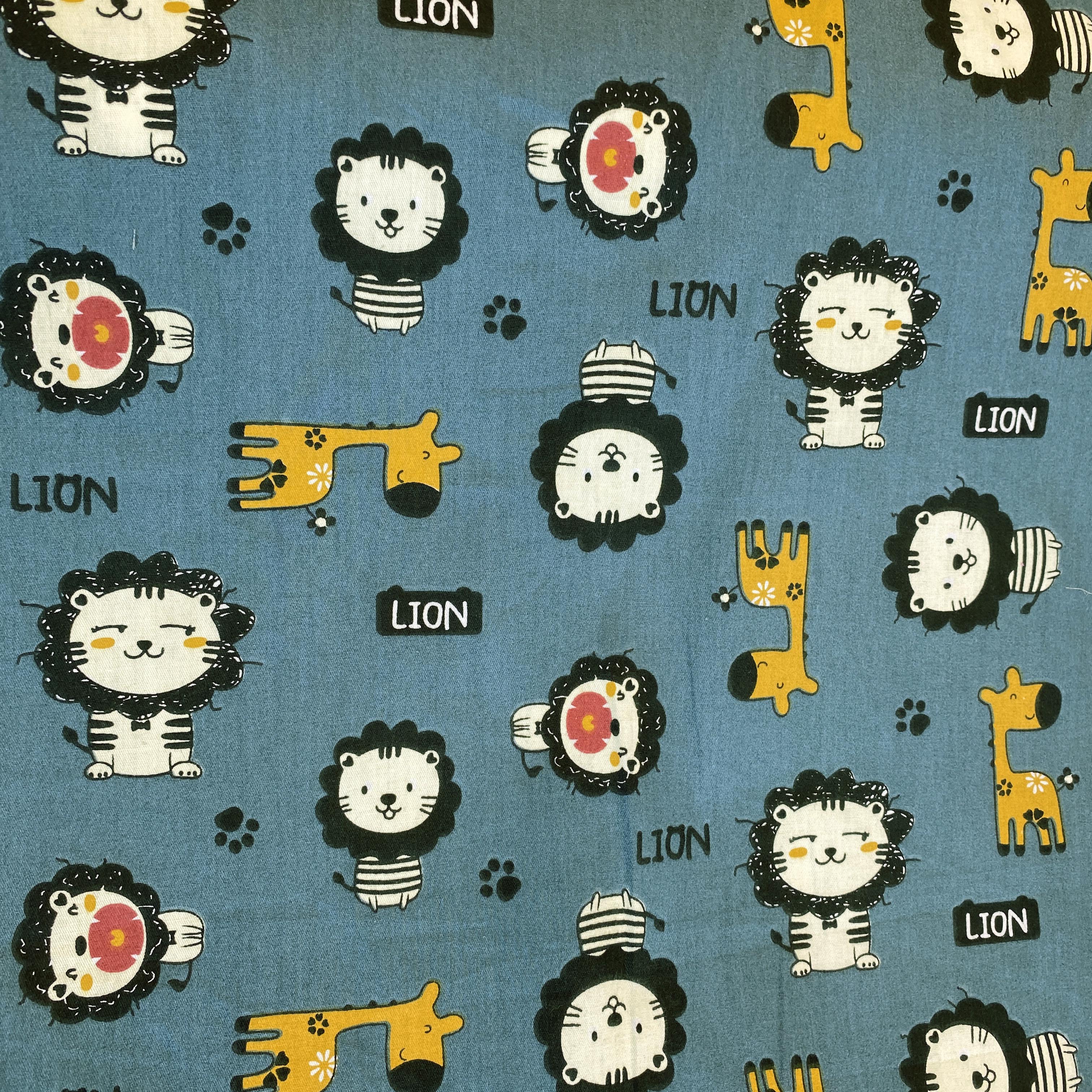 A delightful lightweight African themed children's fabric with lions and giraffes, set on a dark teal/grey background. Suitable for dress fabrics and crafts. Ideal for children's wear, or nurseries.