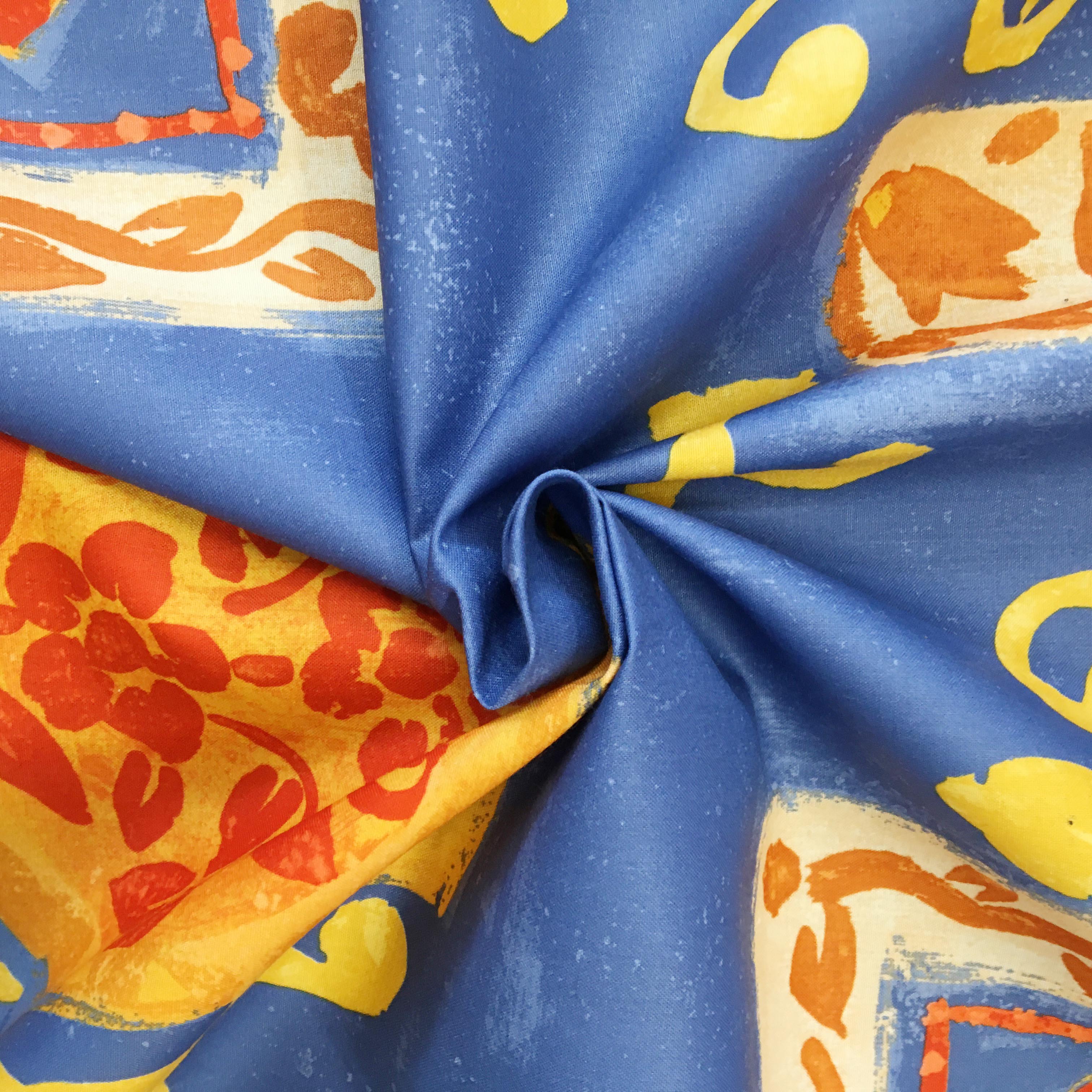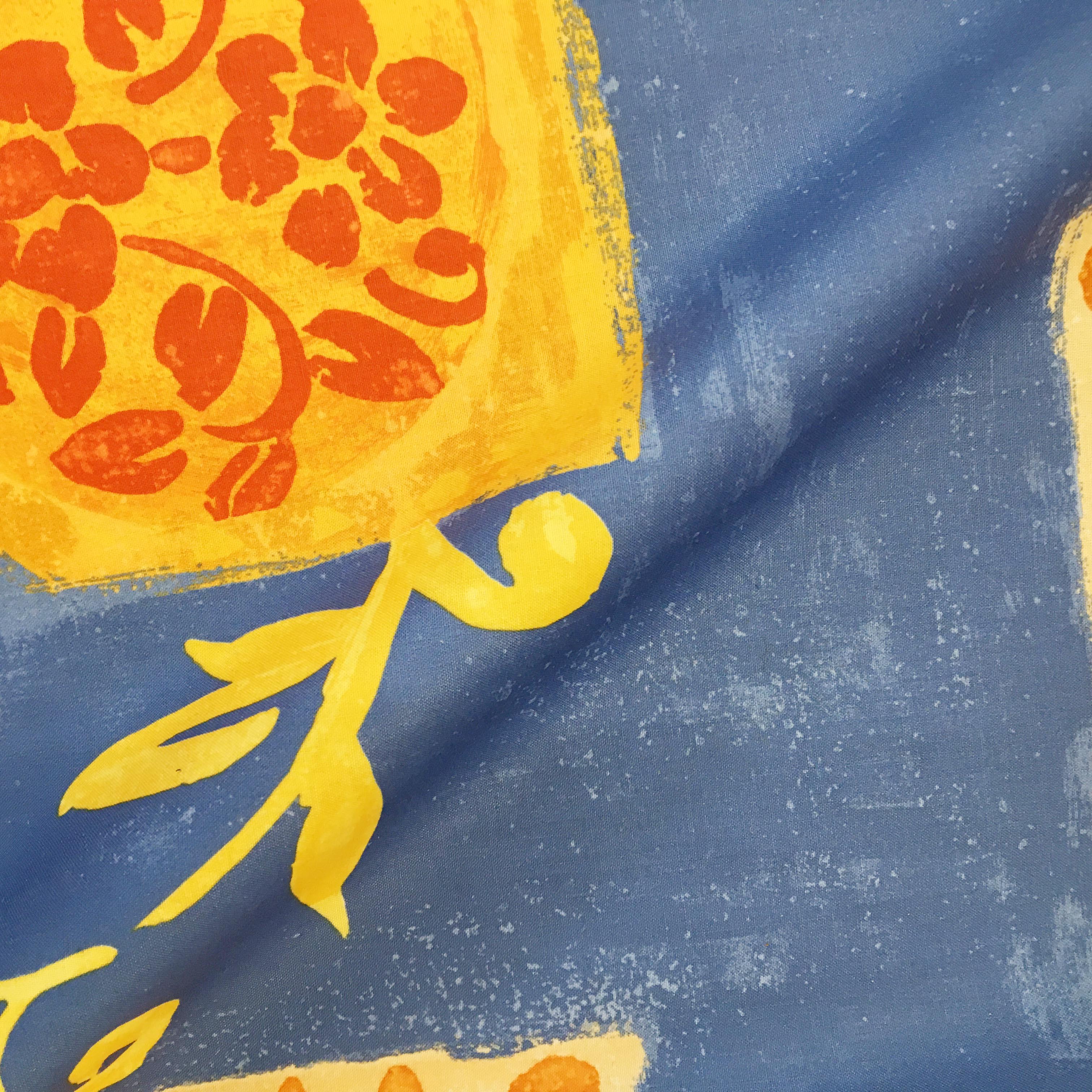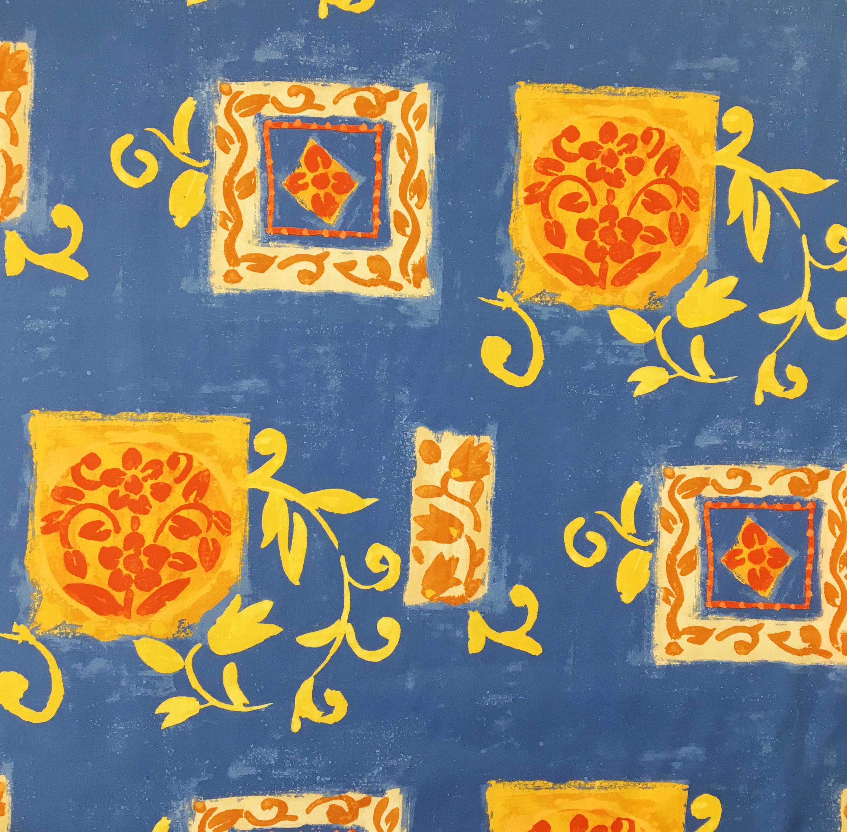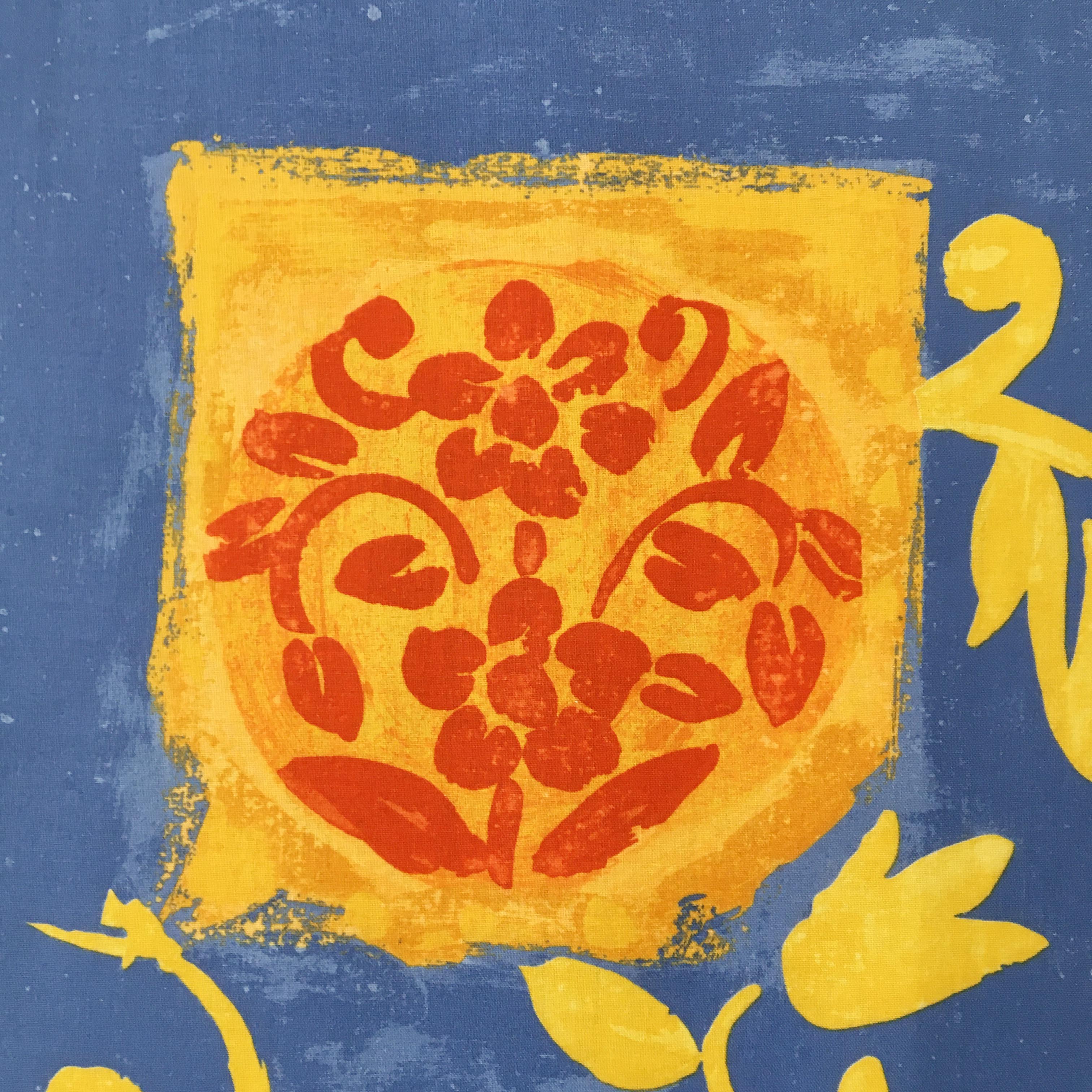 A medium weight fabric in bold tones of red and gold set on a deep blue background. Suitable for soft furnishing, upholstery and crafts, this fabric would be delightful in a conservatory providing a burst of colour for a real Summery feel.