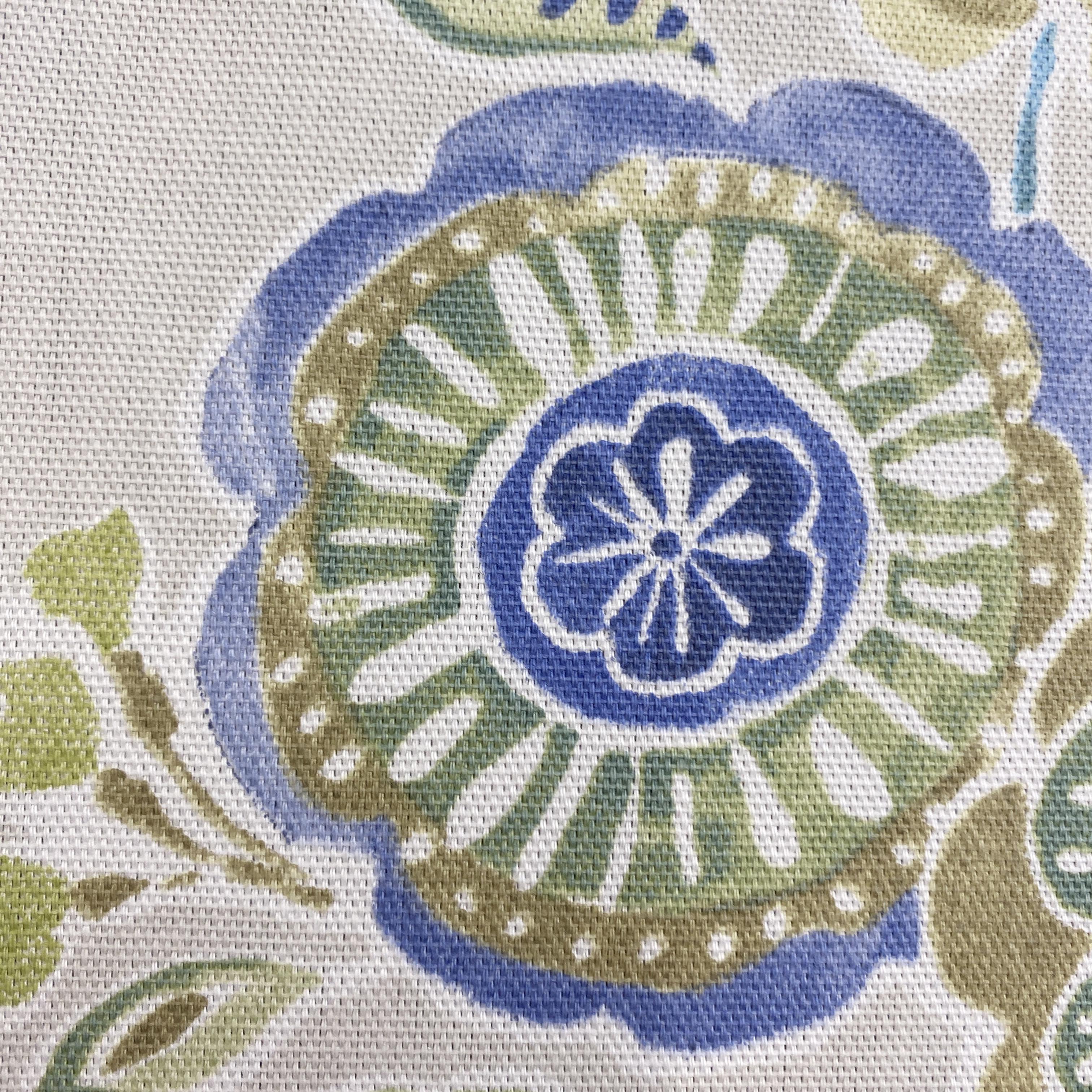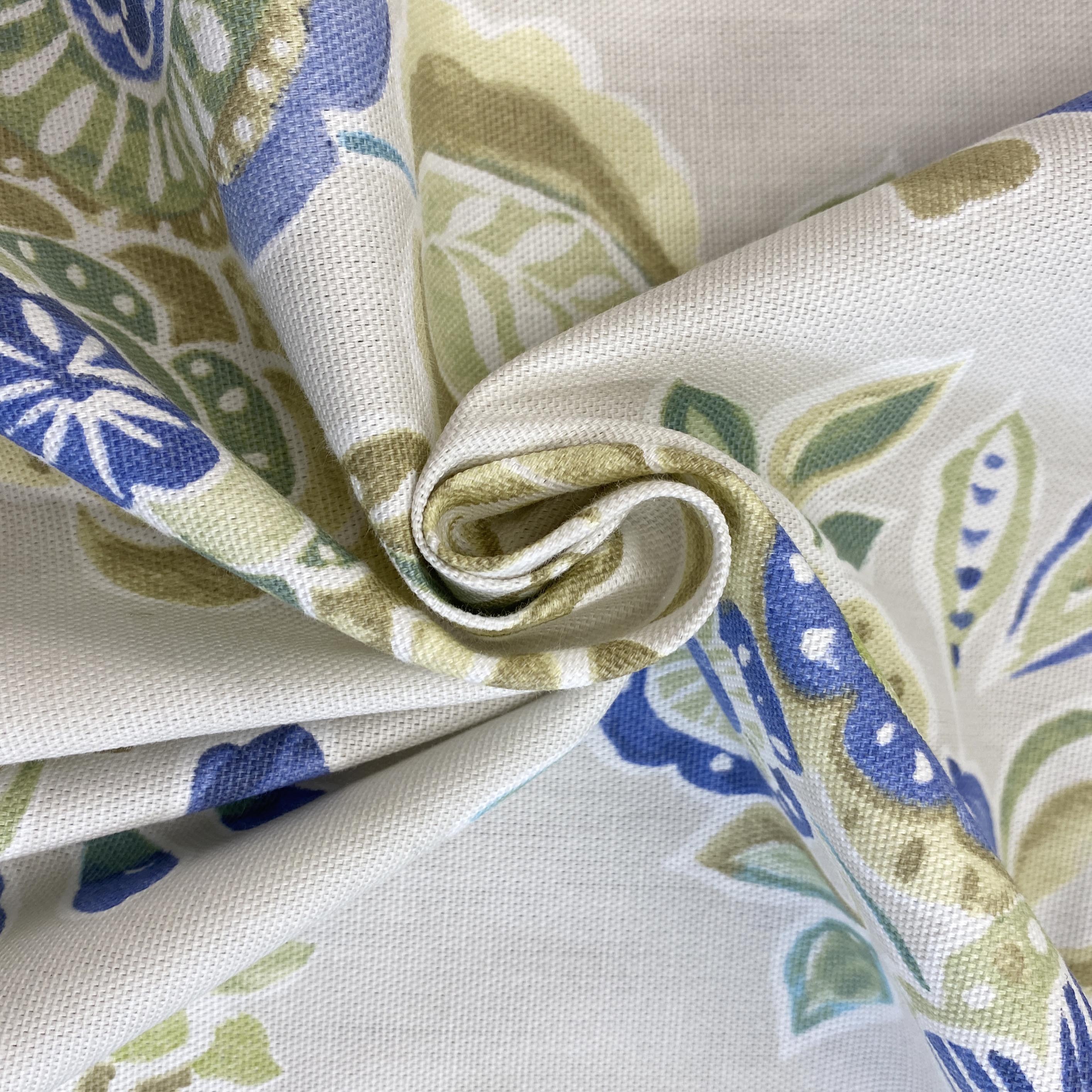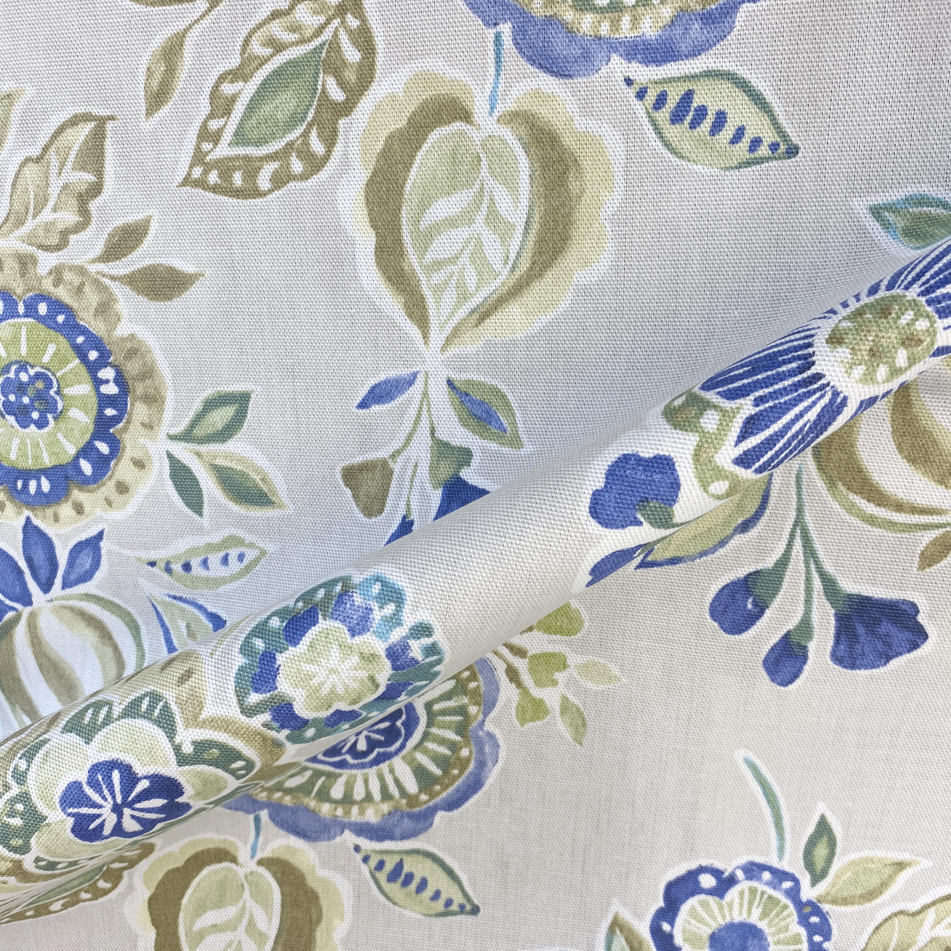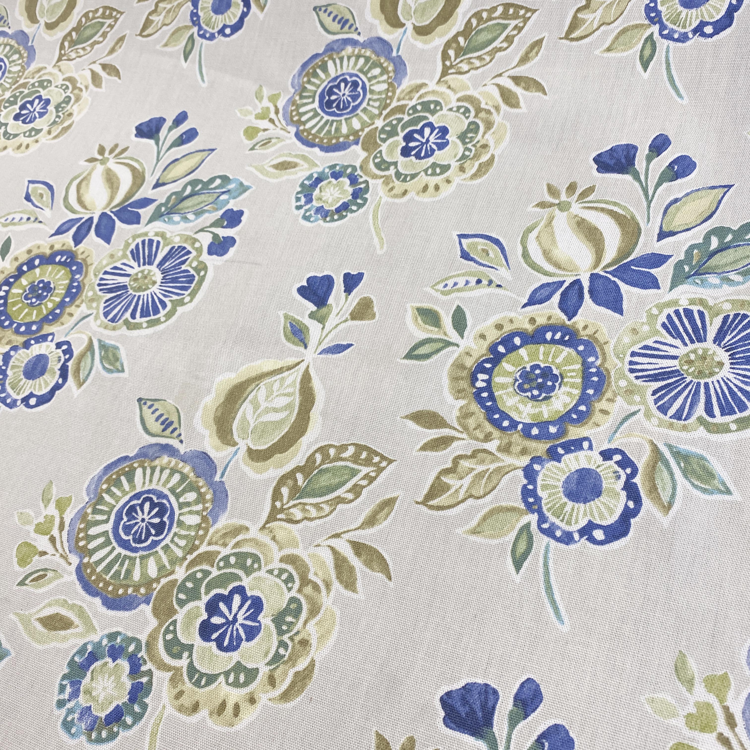 Suitable for soft furnishing and crafts. This medium weight, cotton floral vintage design in tones of blue and green, set on an off-white background is perfect for creating a elegant ambience.
