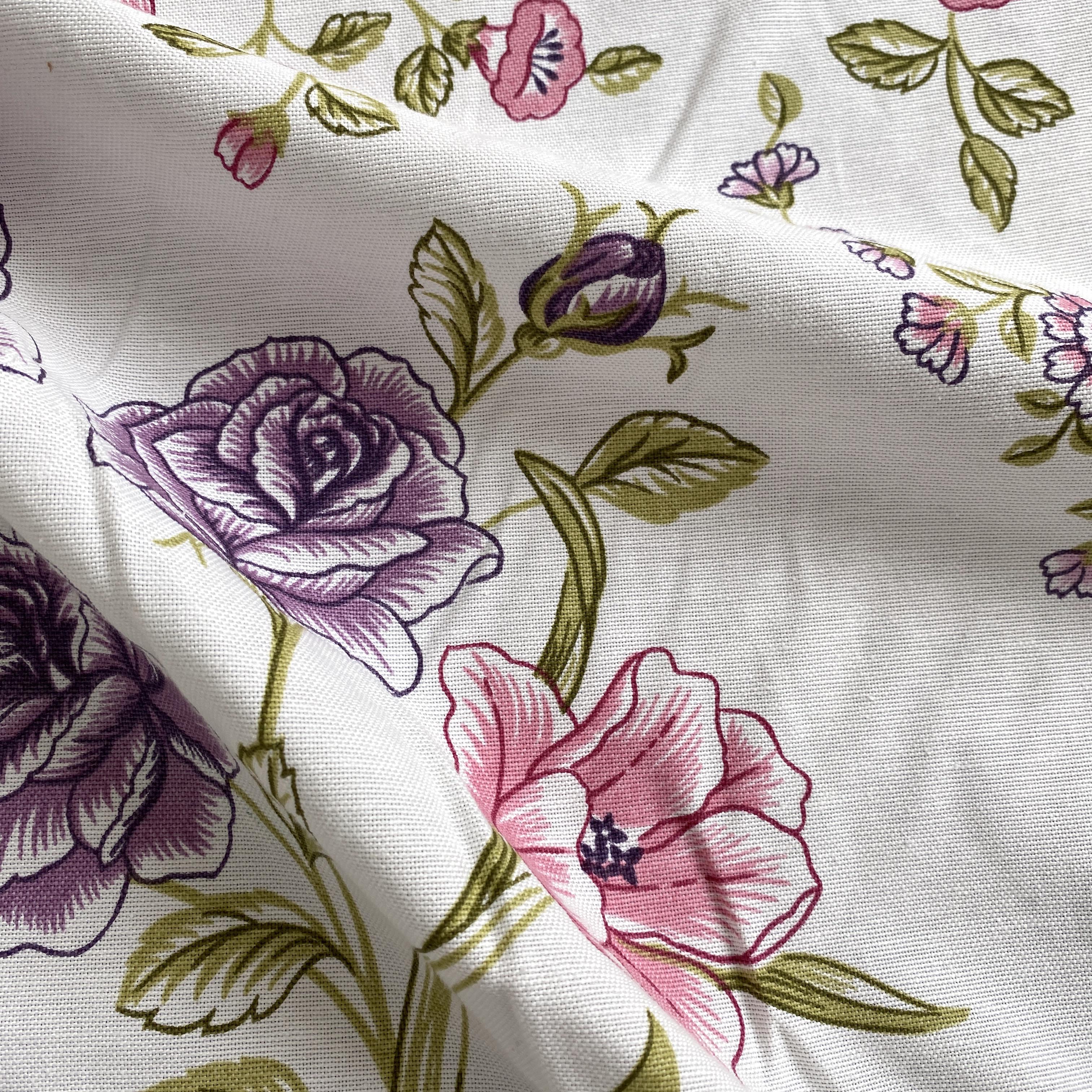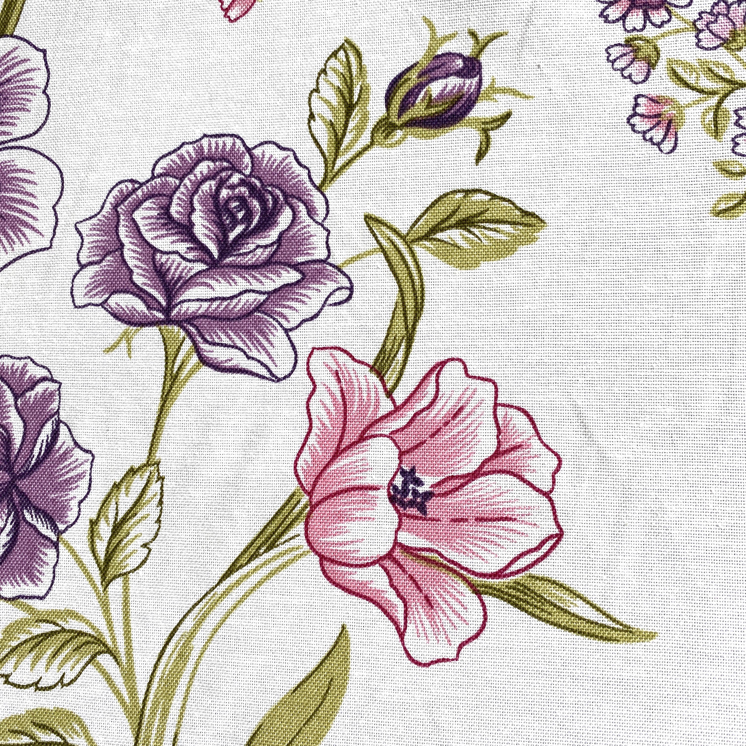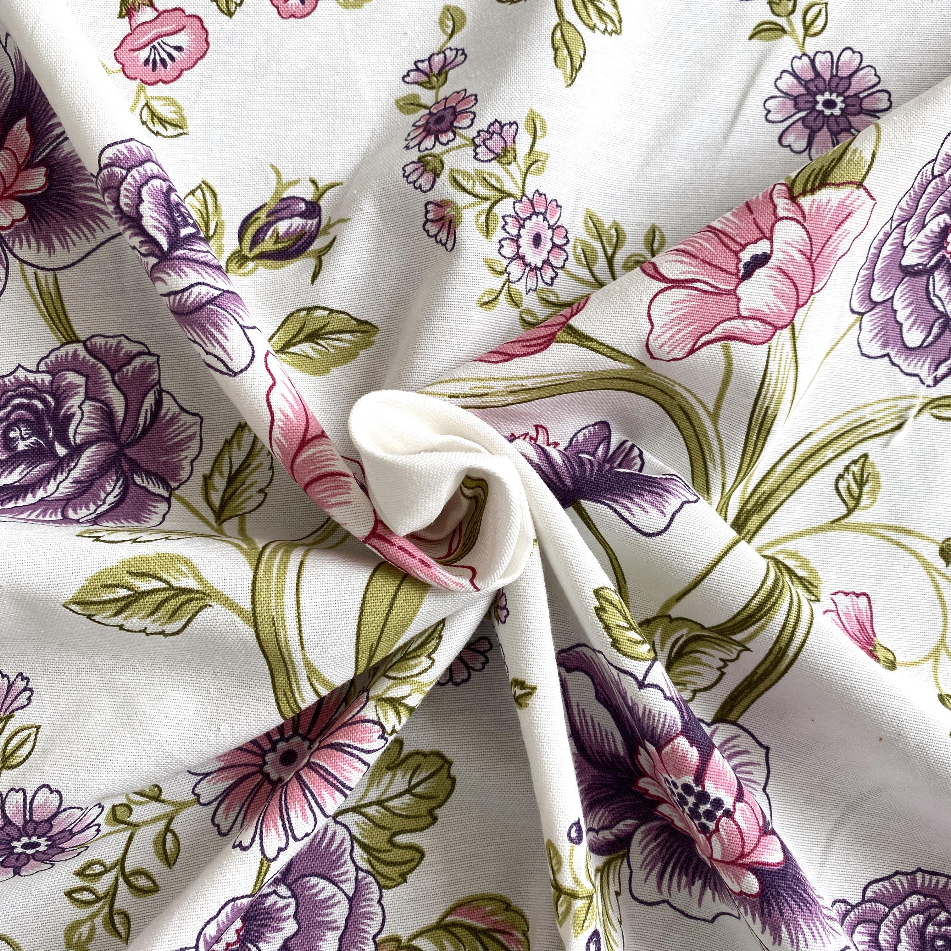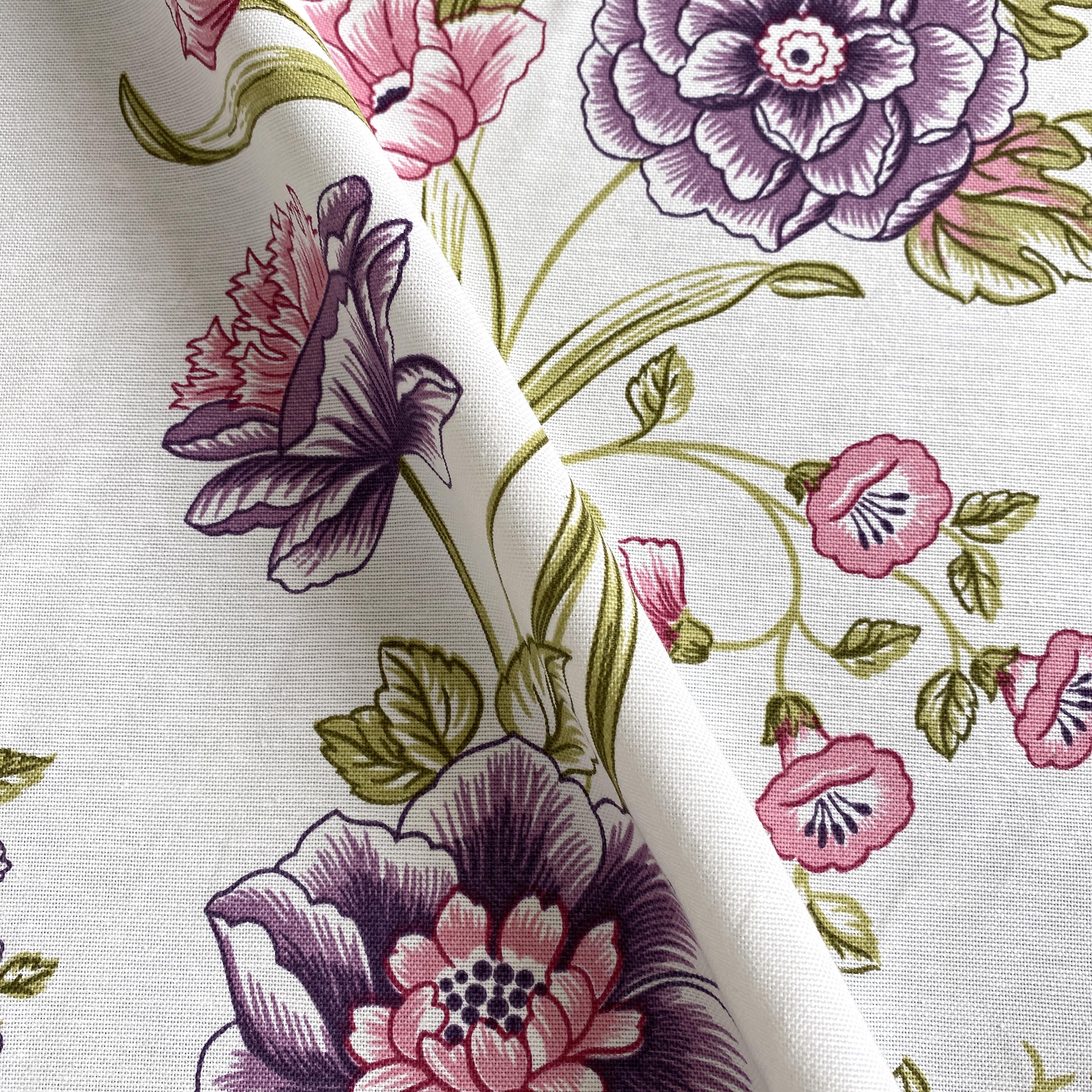 Suitable for soft furnishing projects and crafts. This pretty medium weight cotton floral pattern in tones of purple and pink, set on a white background is perfect for bringing the outside in for a spring garden ambience.