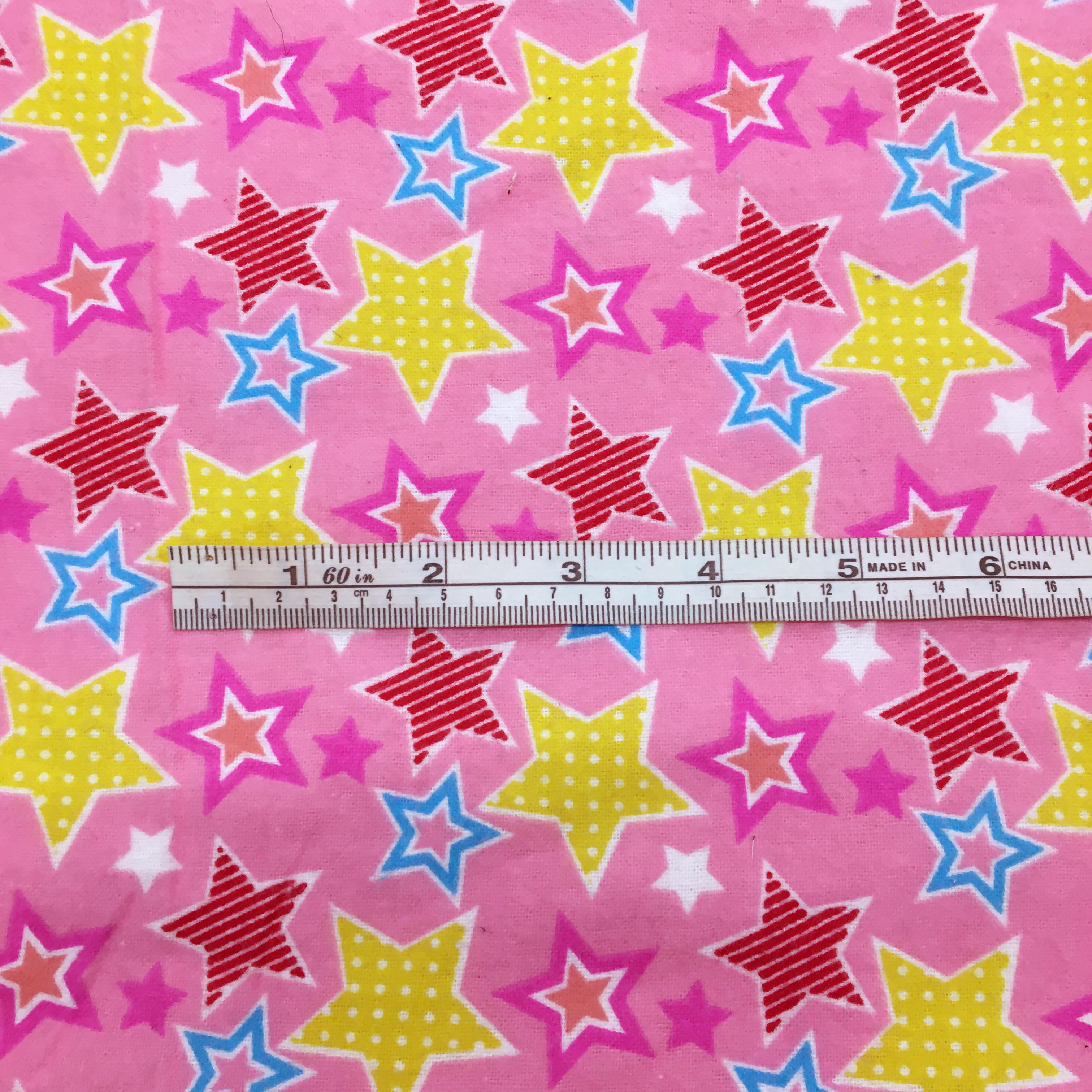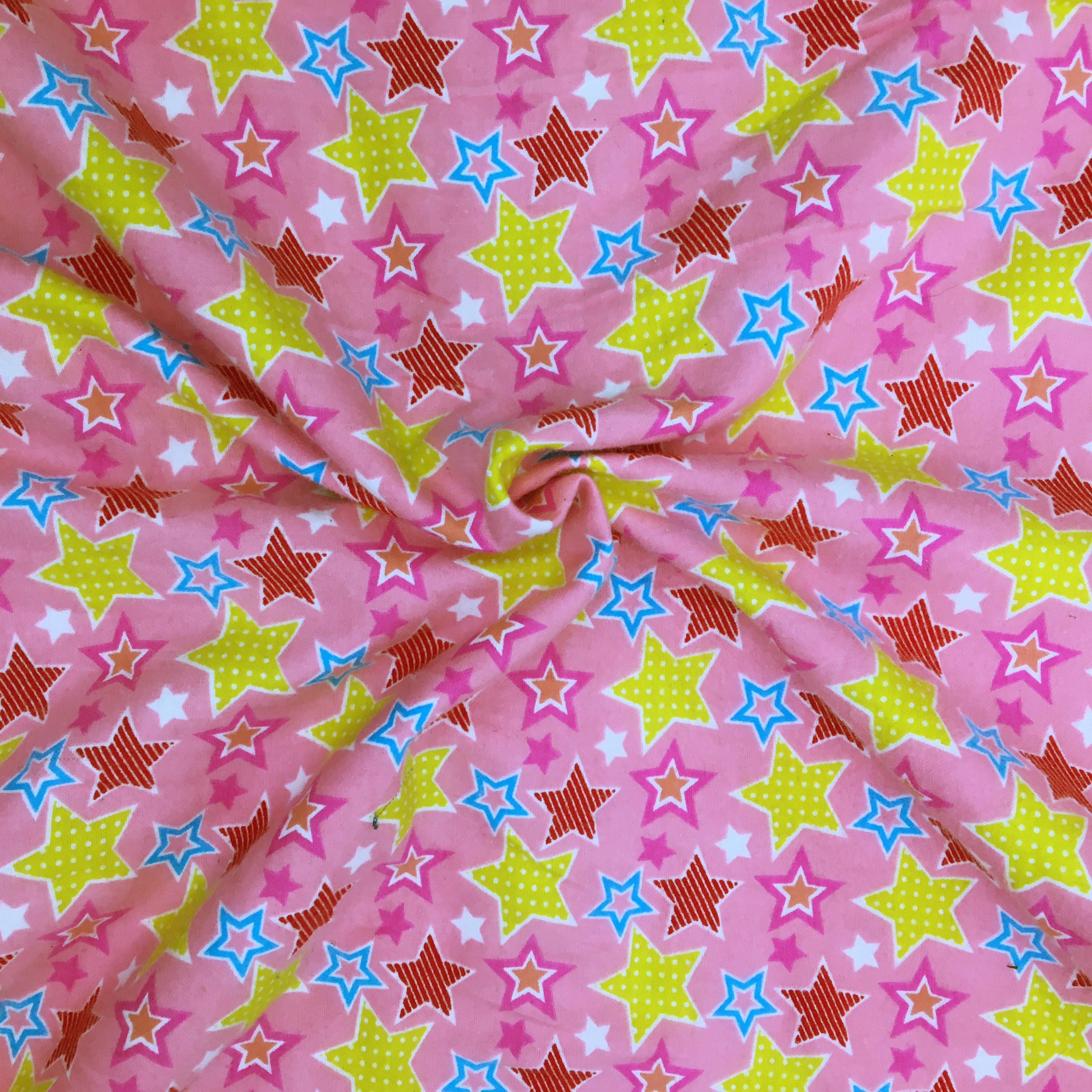A fun, bright star print brushed cotton fabric with a soft feel, suitable dress fabric and craft. Ideal for loungewear and pyjamas.