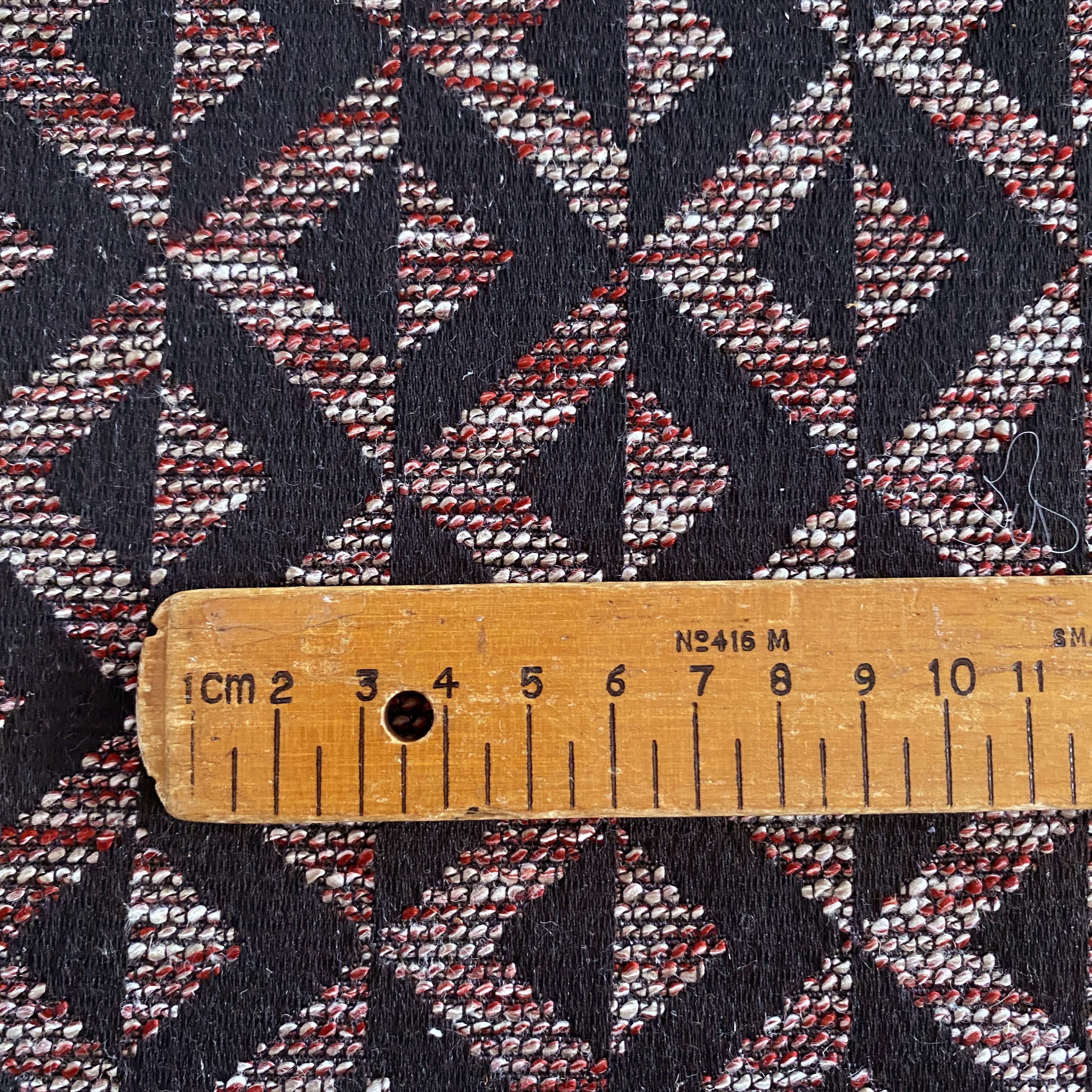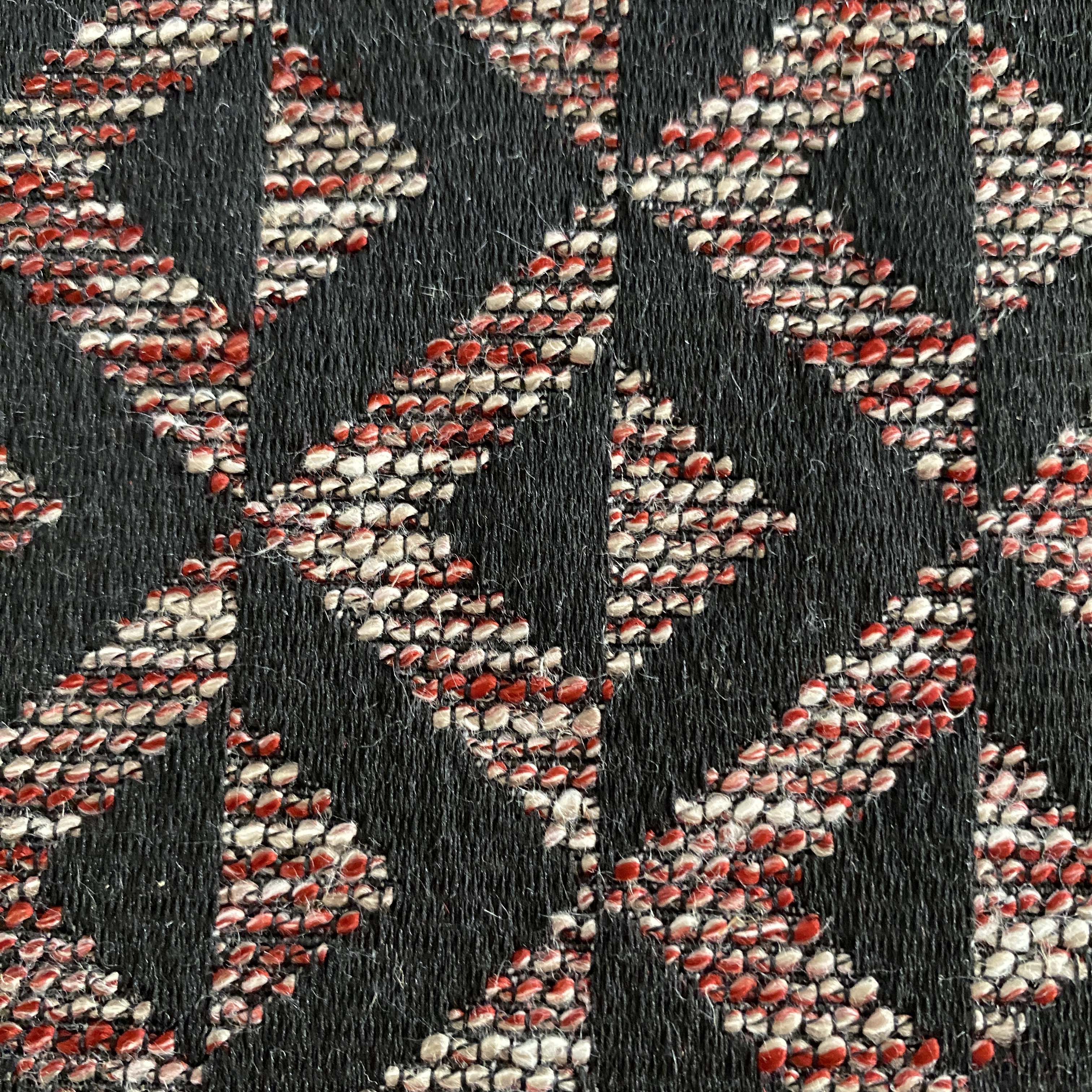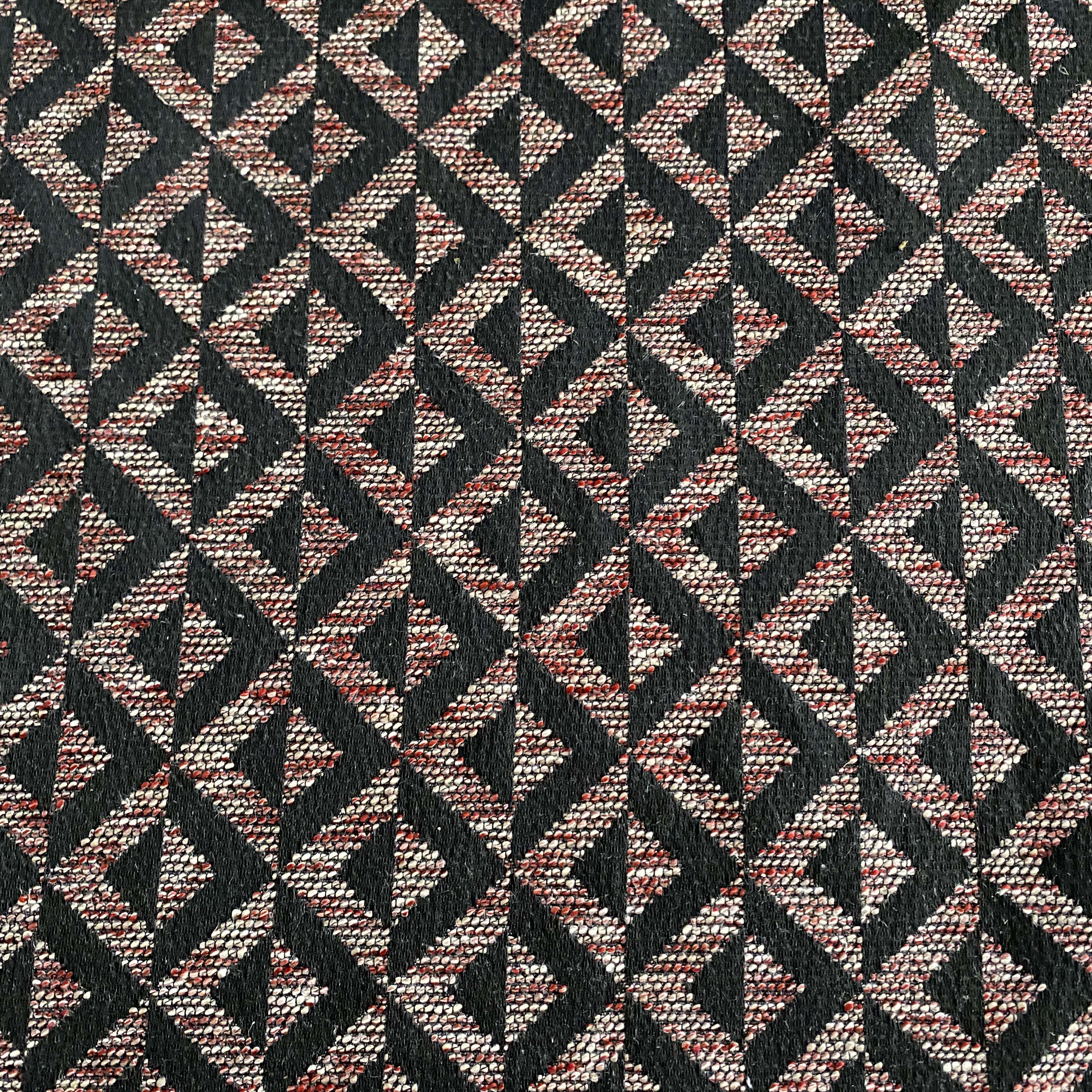 A mixed fibres fabric suitable for soft furnishings and upholstery. A triangle geometric abstract design in tones of red and black. This is the perfect addition to any house to invoke a chic ambience.