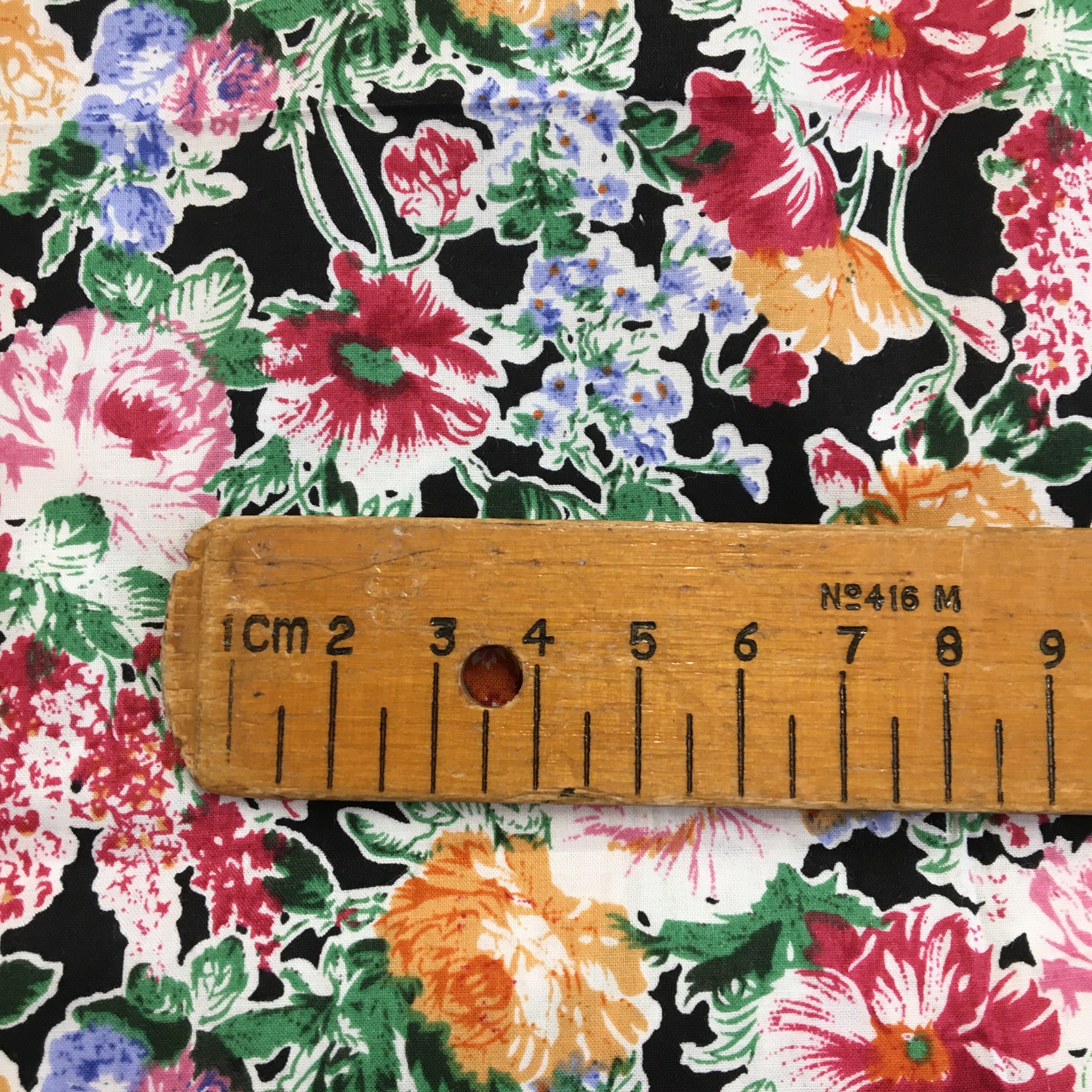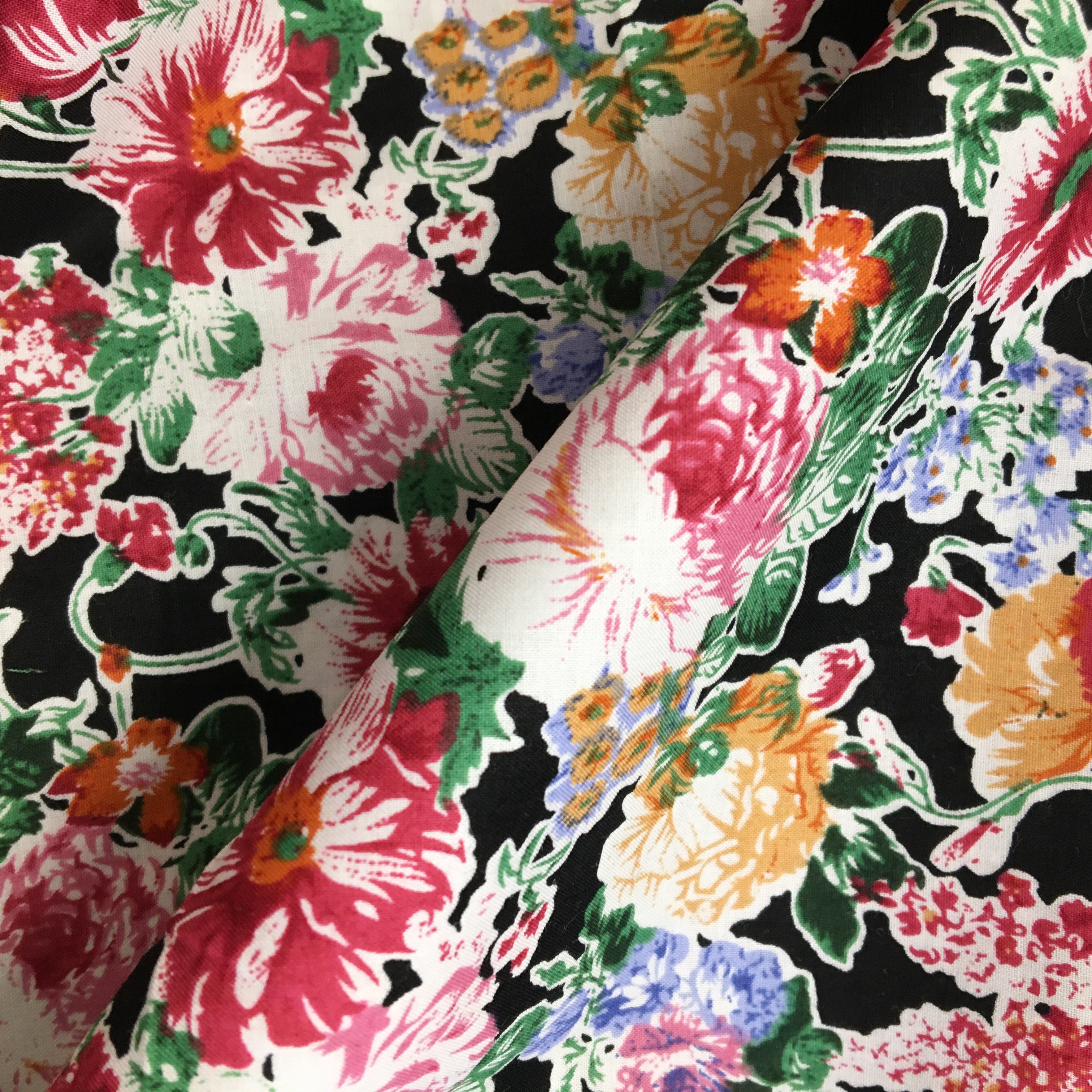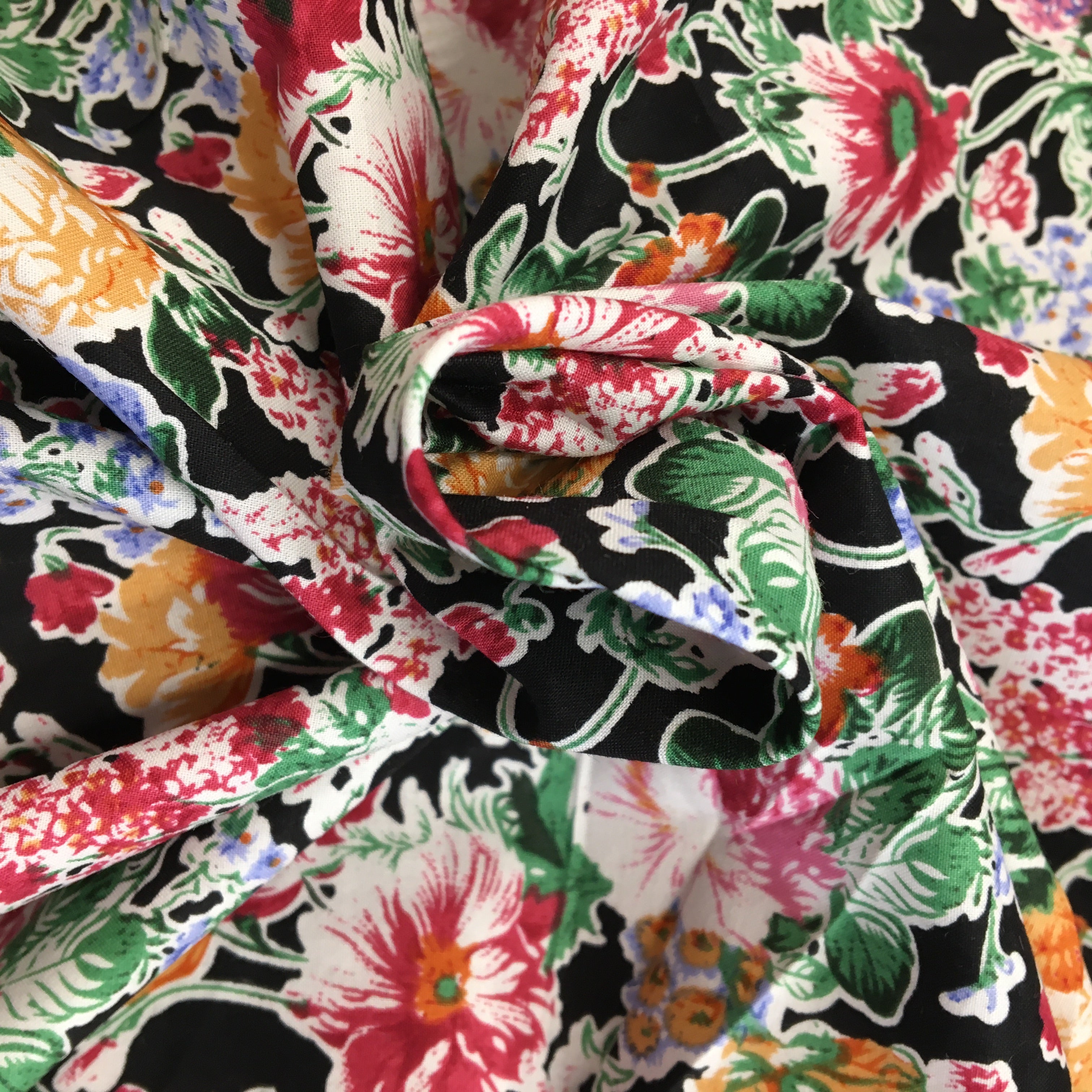 This classy floral bouquet print set on a black background would be perfect for a little Summer dress or blouse. Ideal for dress wear.