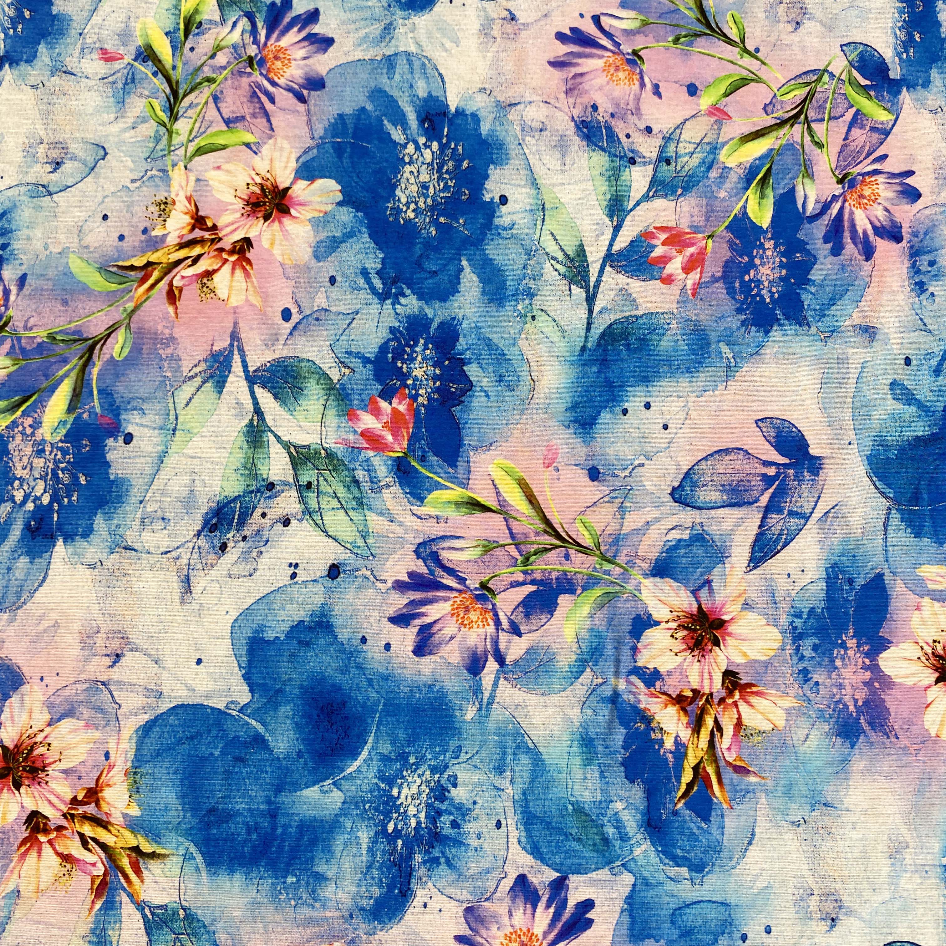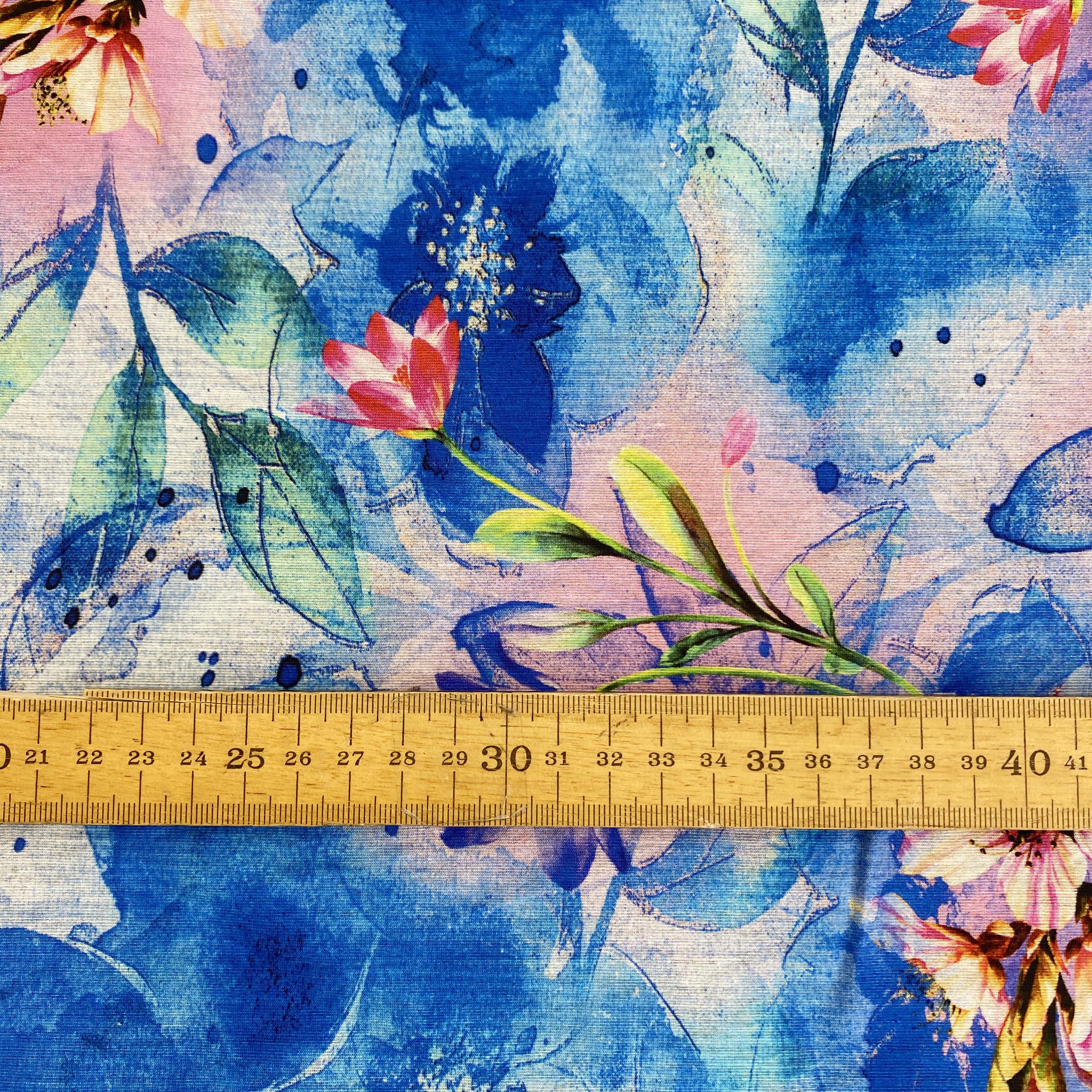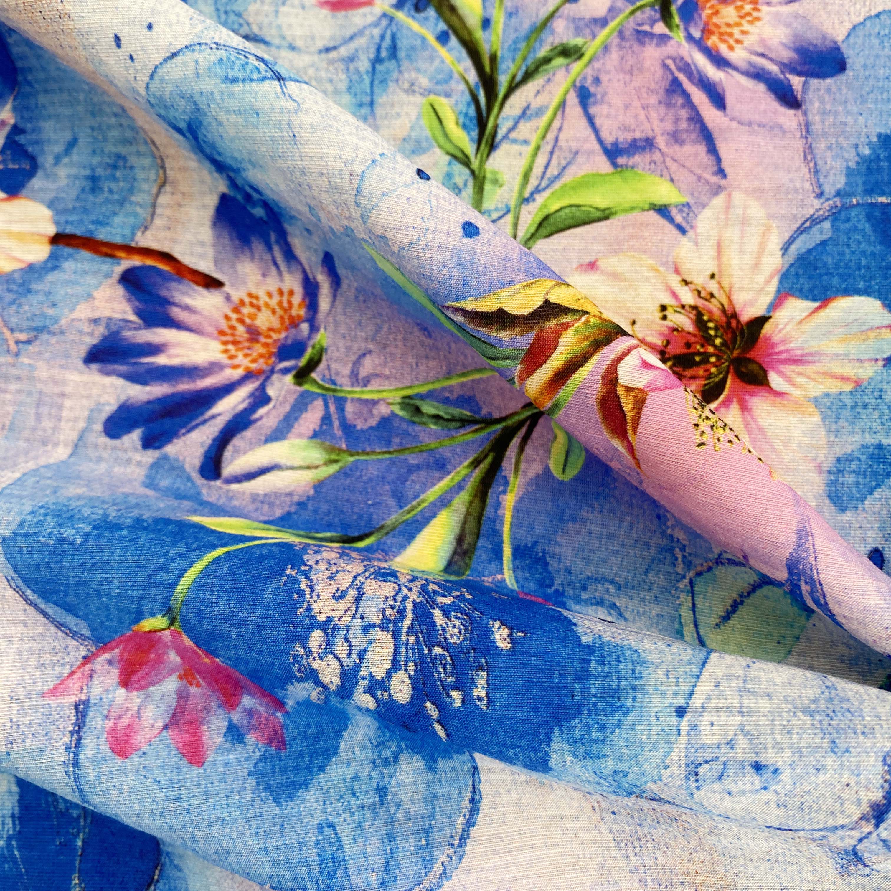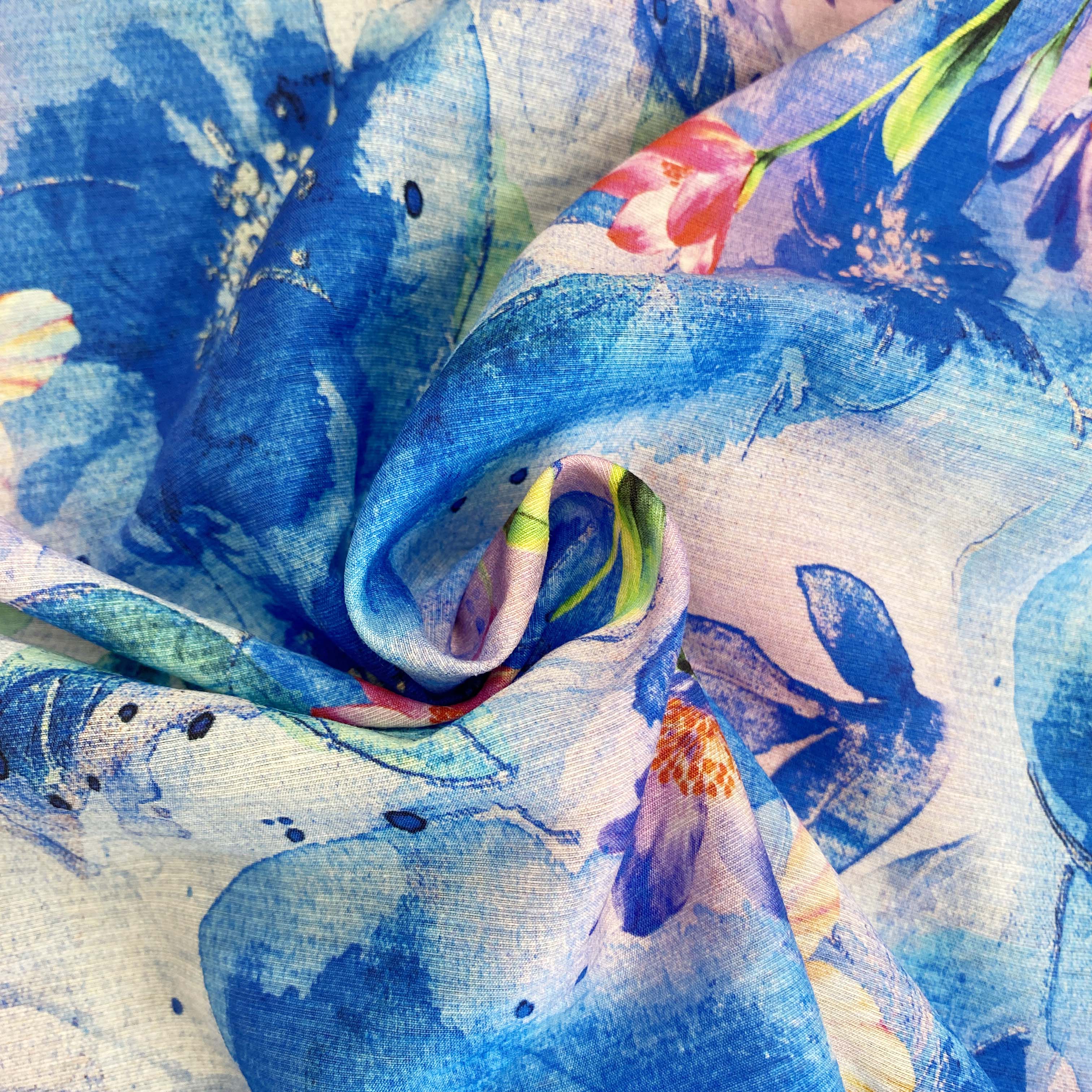 This beautiful fabric with a bright blue mix floral design background would be ideal for dress making and crafts. Its very lightweight soft drape makes it ideal for dresses and beachwear - perfect for a pretty sarong this Summer.