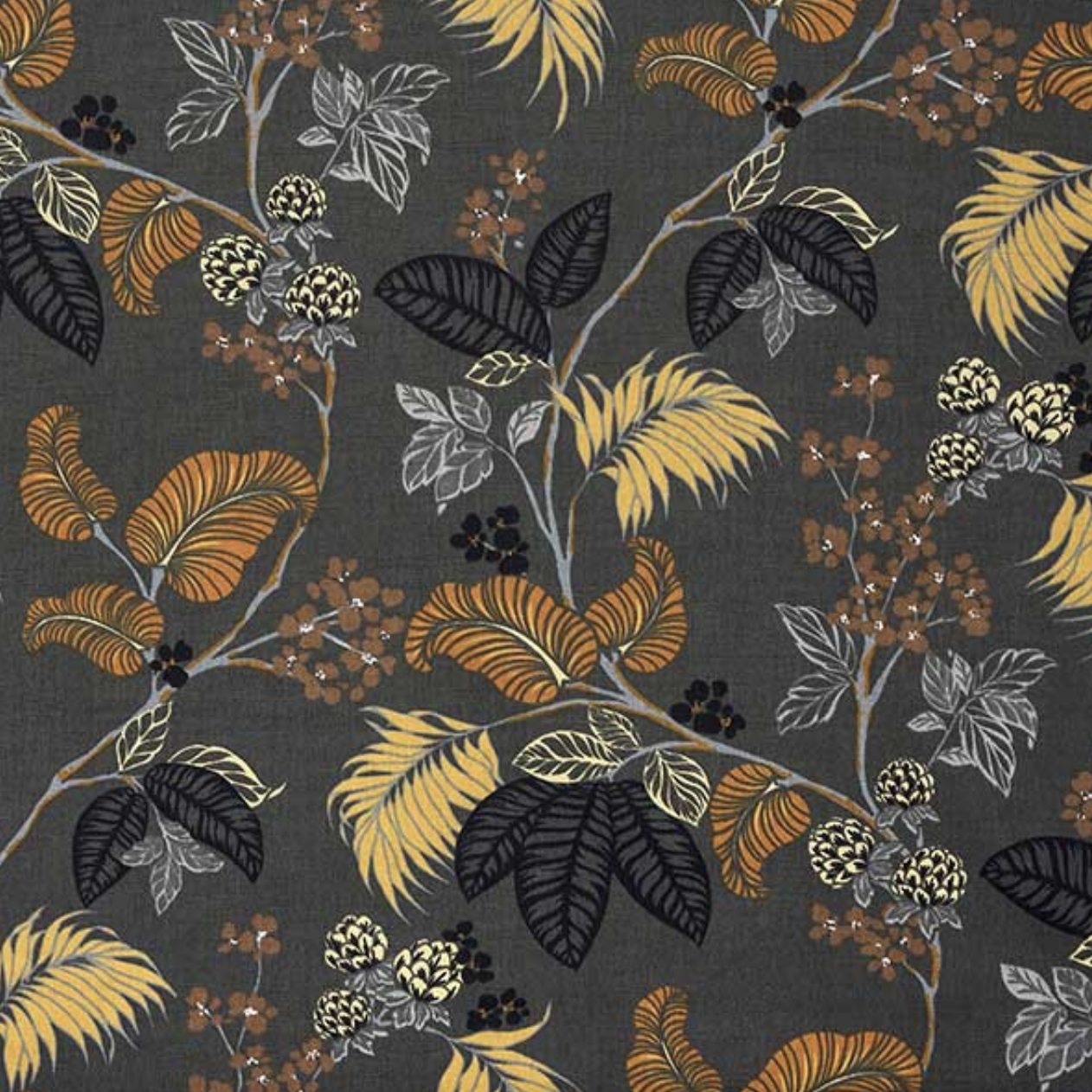 A stunning leaf design, in Autumnal tones of rustic orange and yellow, set on a charcoal grey background. Suitable for soft furnishings, blinds, curtains and light upholstery. Ideal for making a statement.