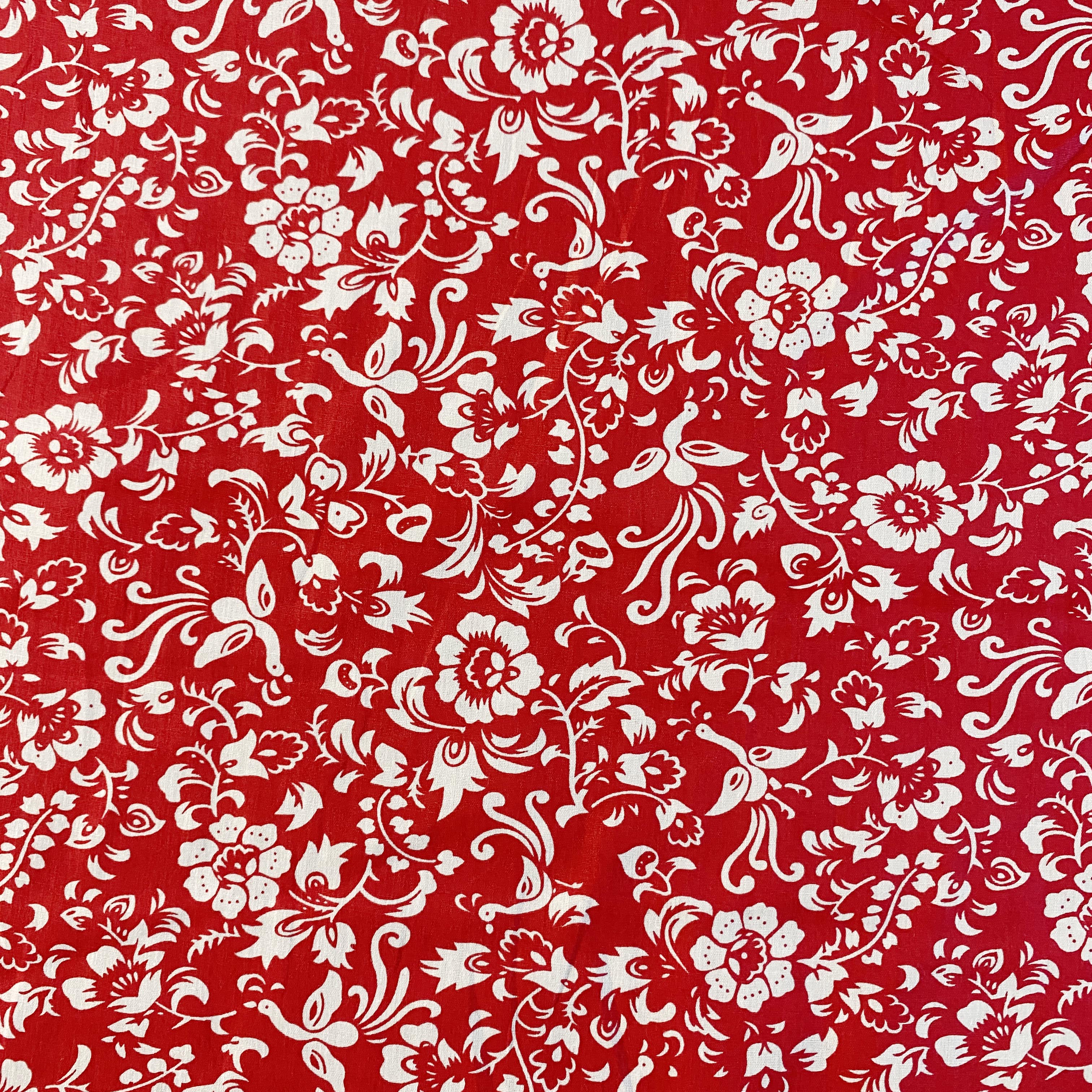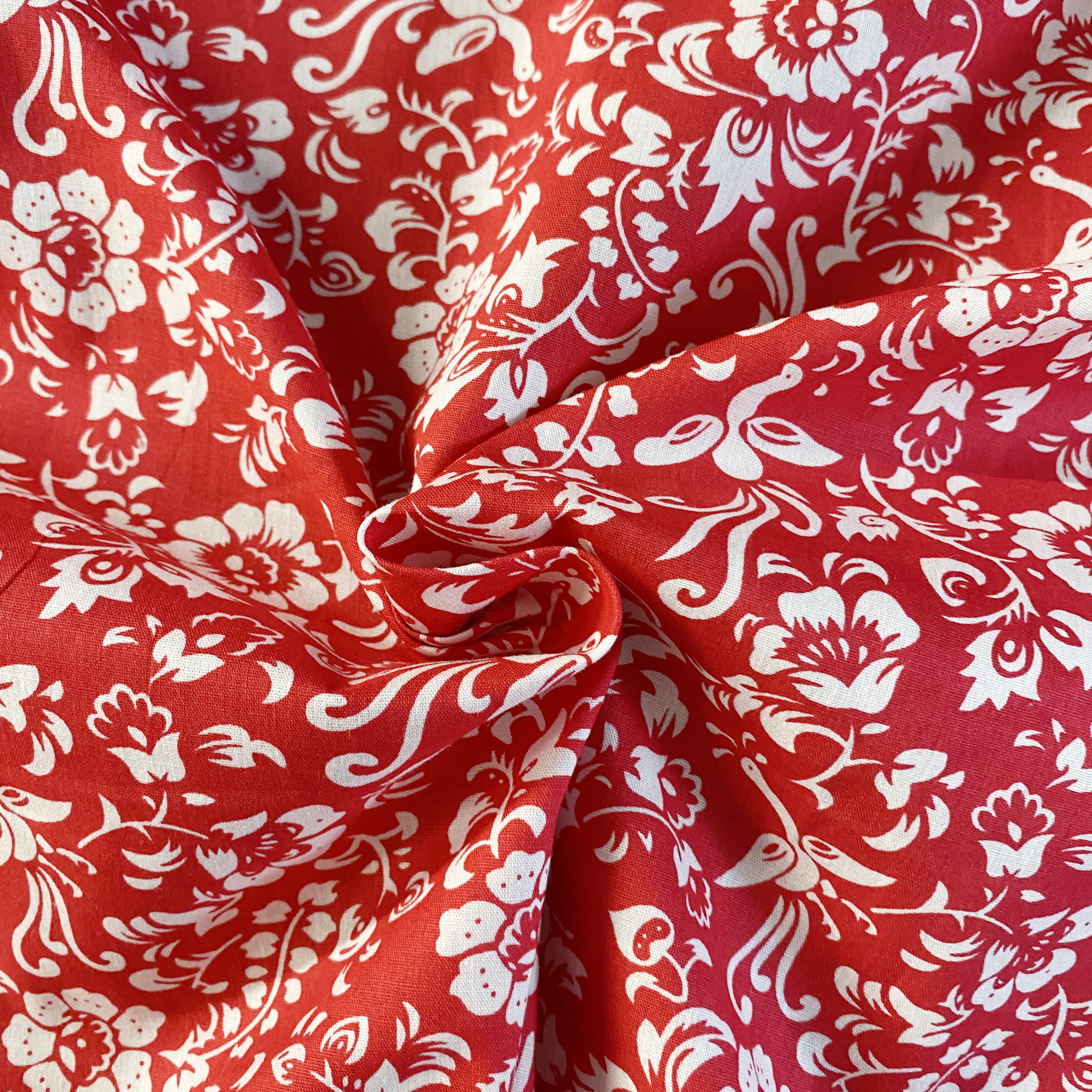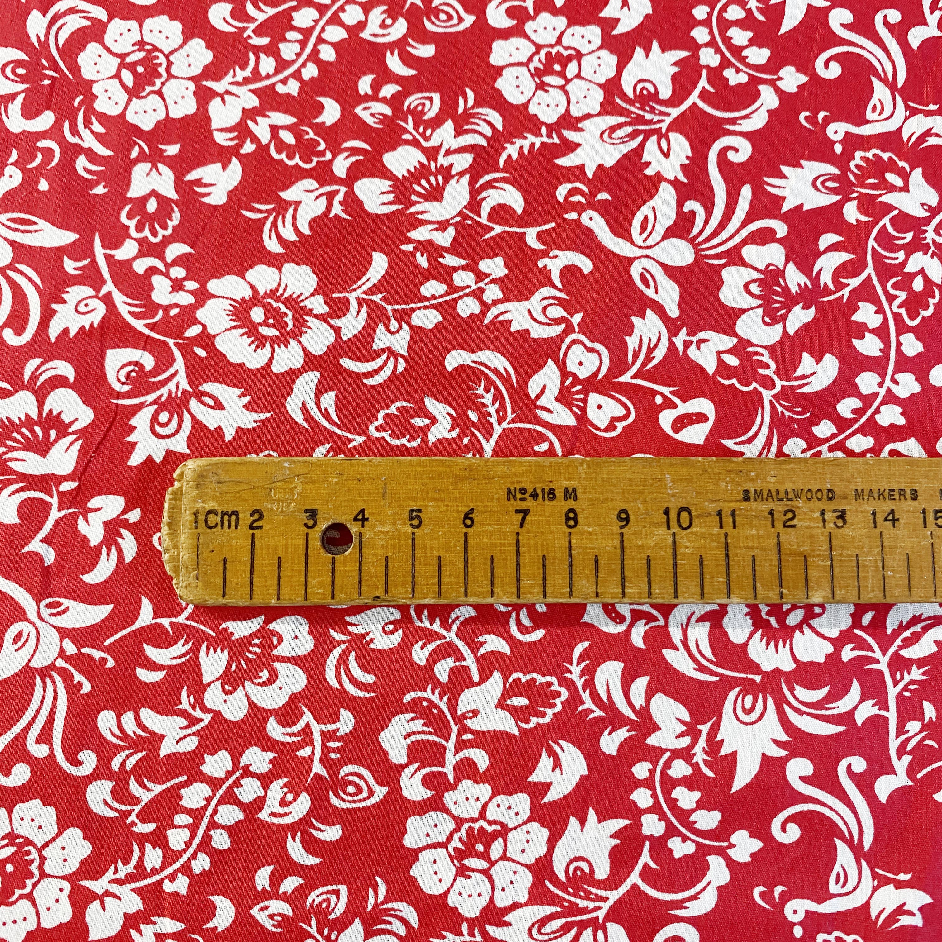 Fantastic value lightweight cotton print fabric with a pretty white floral design on a cherry red background. Would be ideal for dress making, crafts and accessories.